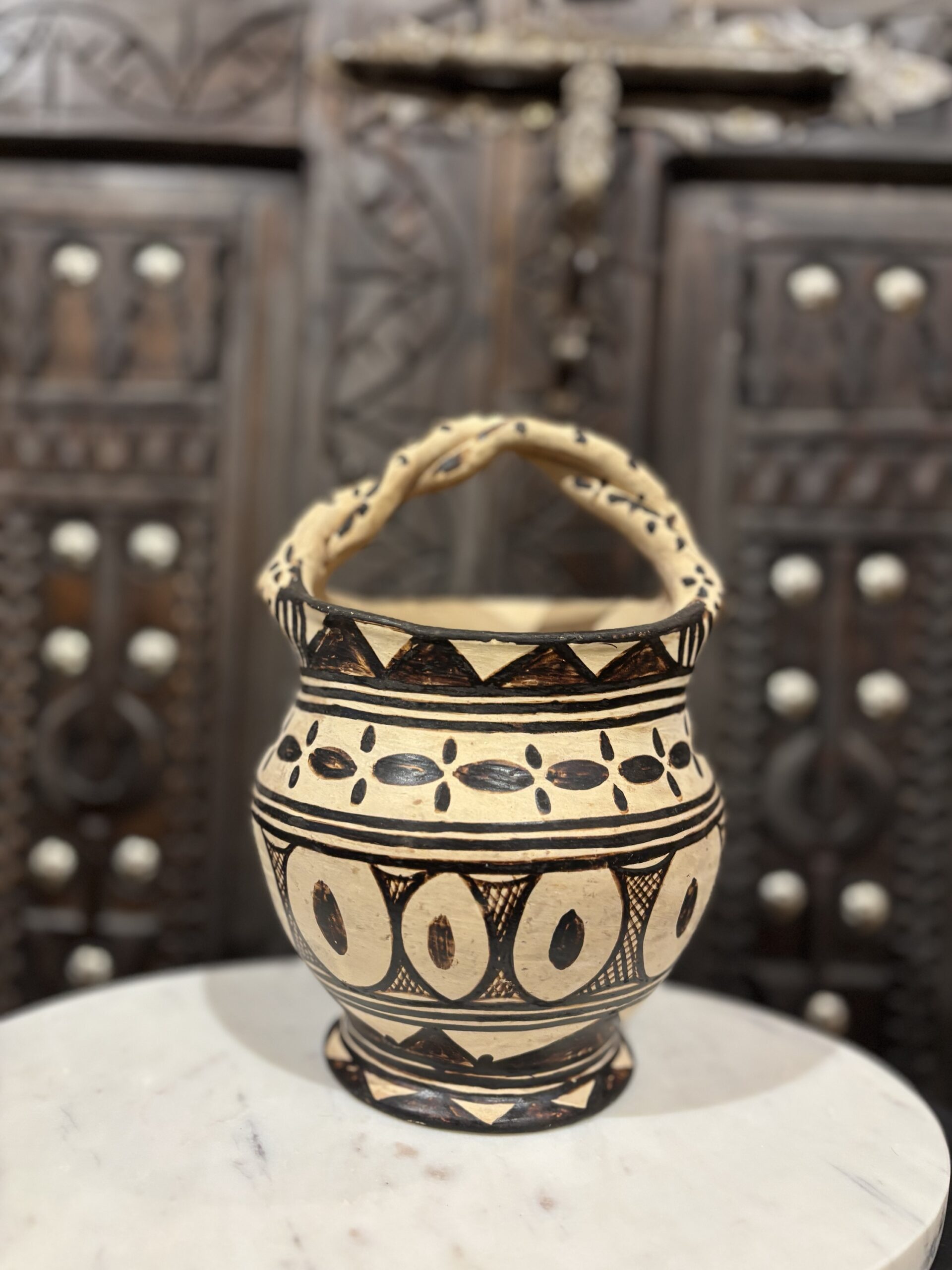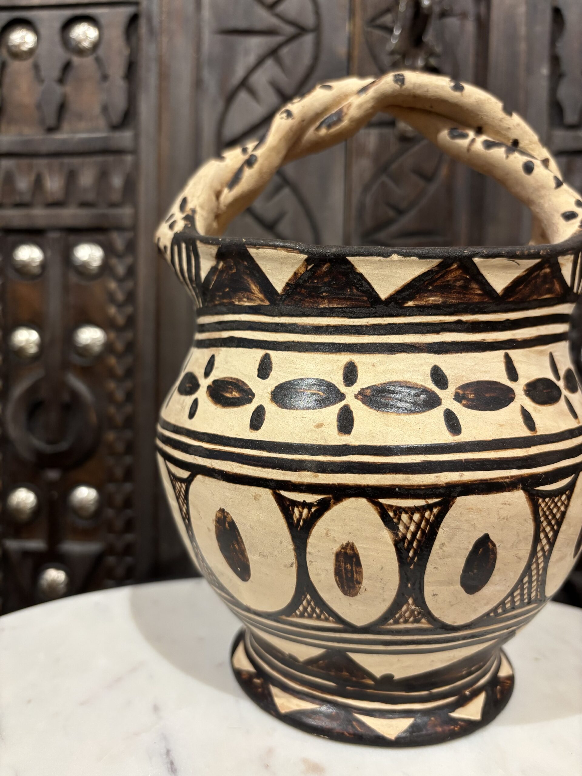 Deze berber kruik is handgemaakt in Marokko. Hij is beschilderd met Henna. Je kan de kruik decoratief gebruiken of je keuken gerei in doen. Hij is 17 cm hoog en 15 cm breed.
