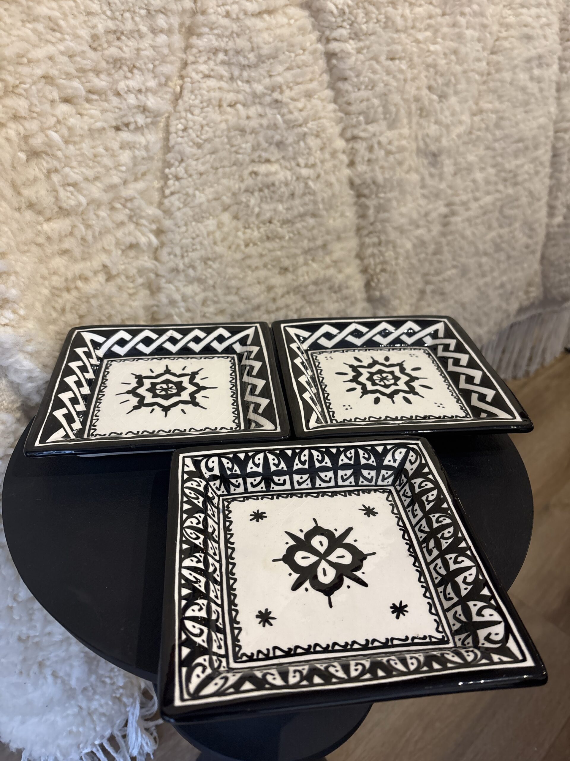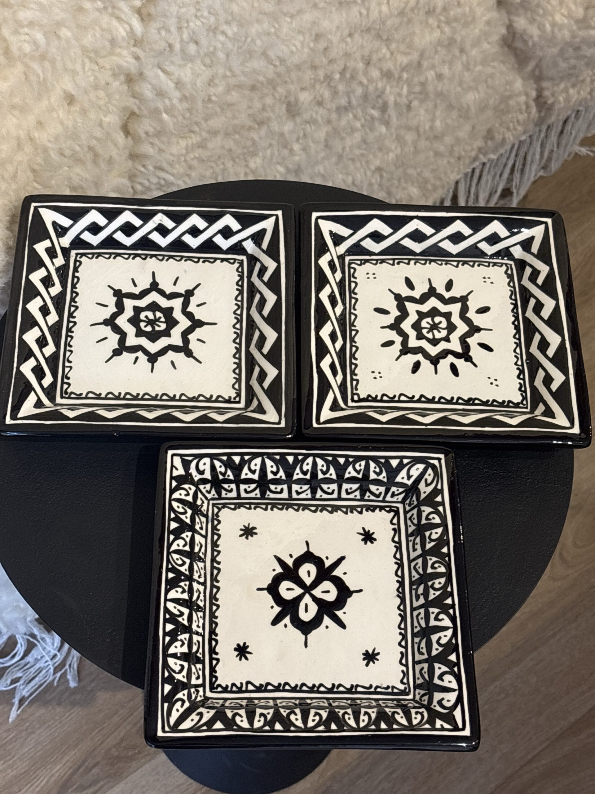 De borden zijn handgemaakt en zijn 18x18cm. Je kan ze gebruiken om bijvoorbeeld sierraden op te leggen, of om hapjes te serveren.