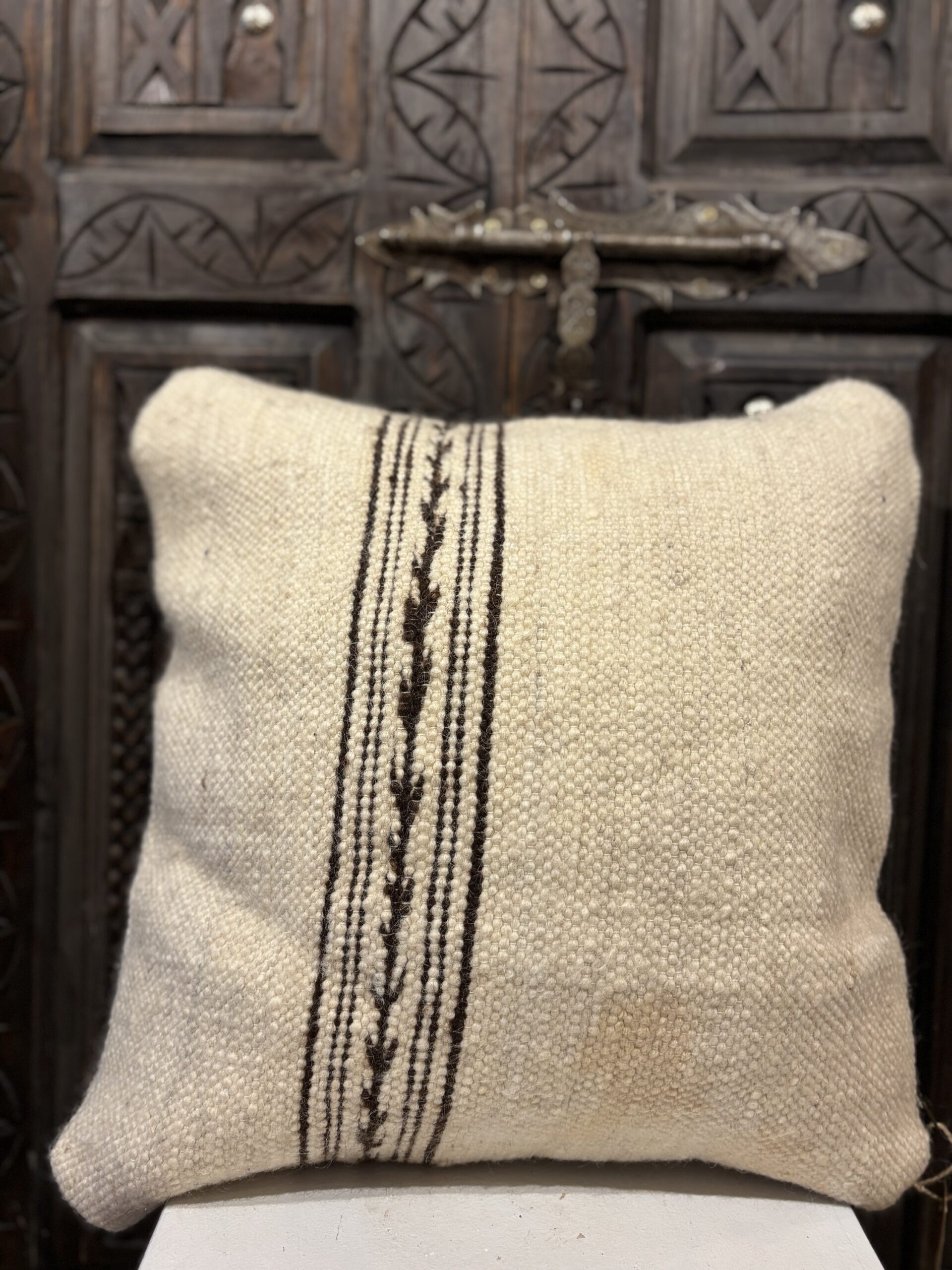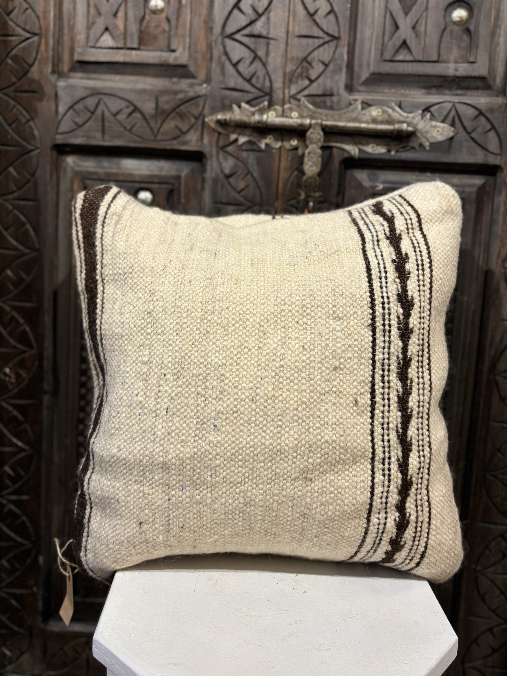 Vintage Berber kussen 🤎 Handgemaakt in Marokko van zachte wol met traditionele patronen. Een uniek item dat warmte en karakter brengt in je interieur. Mooi op de bank, een stoel of als sfeervolle eyecatcher op bed. De kussen is handgemaakt waardoor de maten kunnen afwijken. 40×40