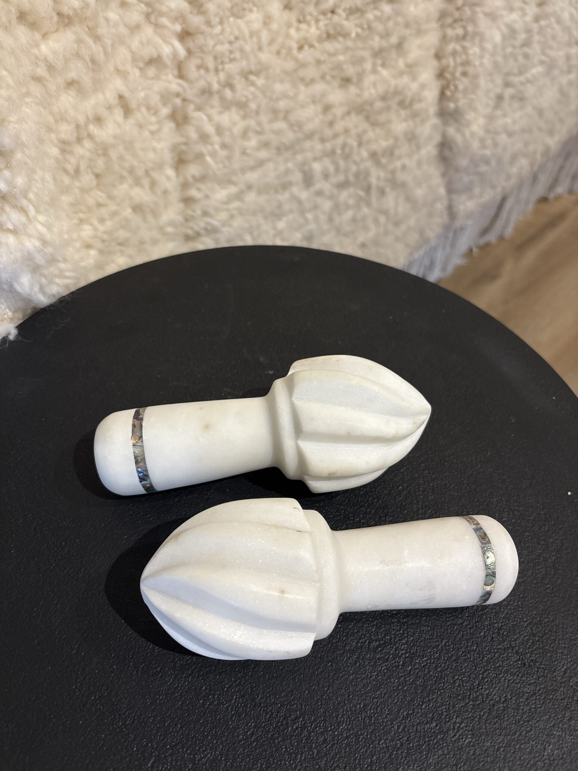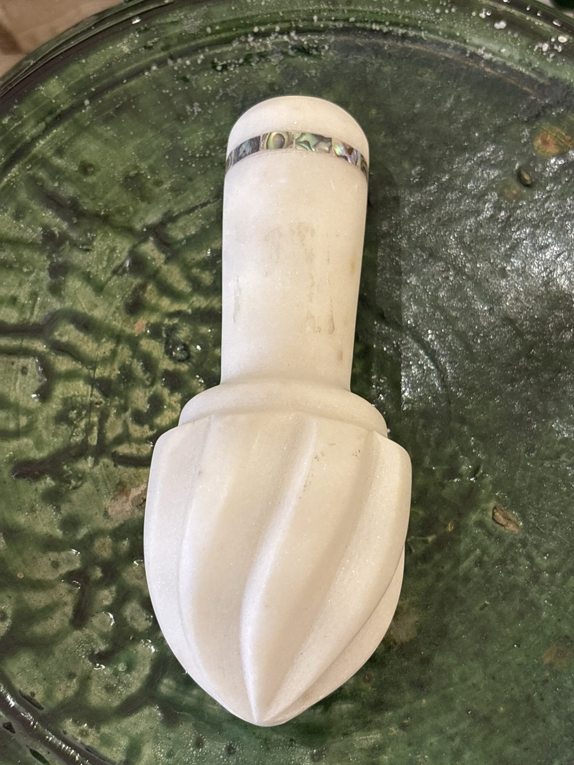 Deze marmeren citruspers is afgewerkt met parelmoer. Een prachtige eyecatcher voor in de keuken.