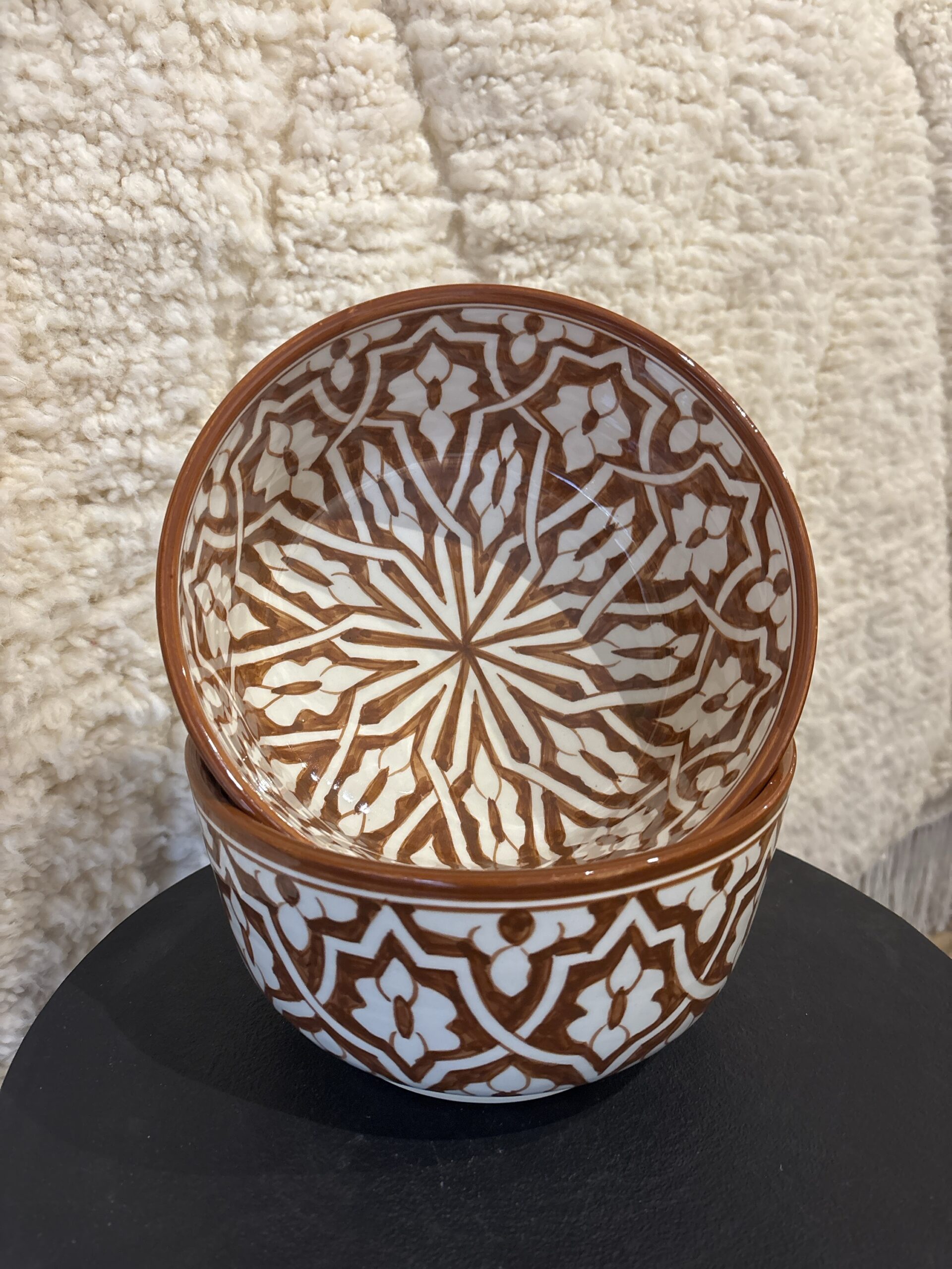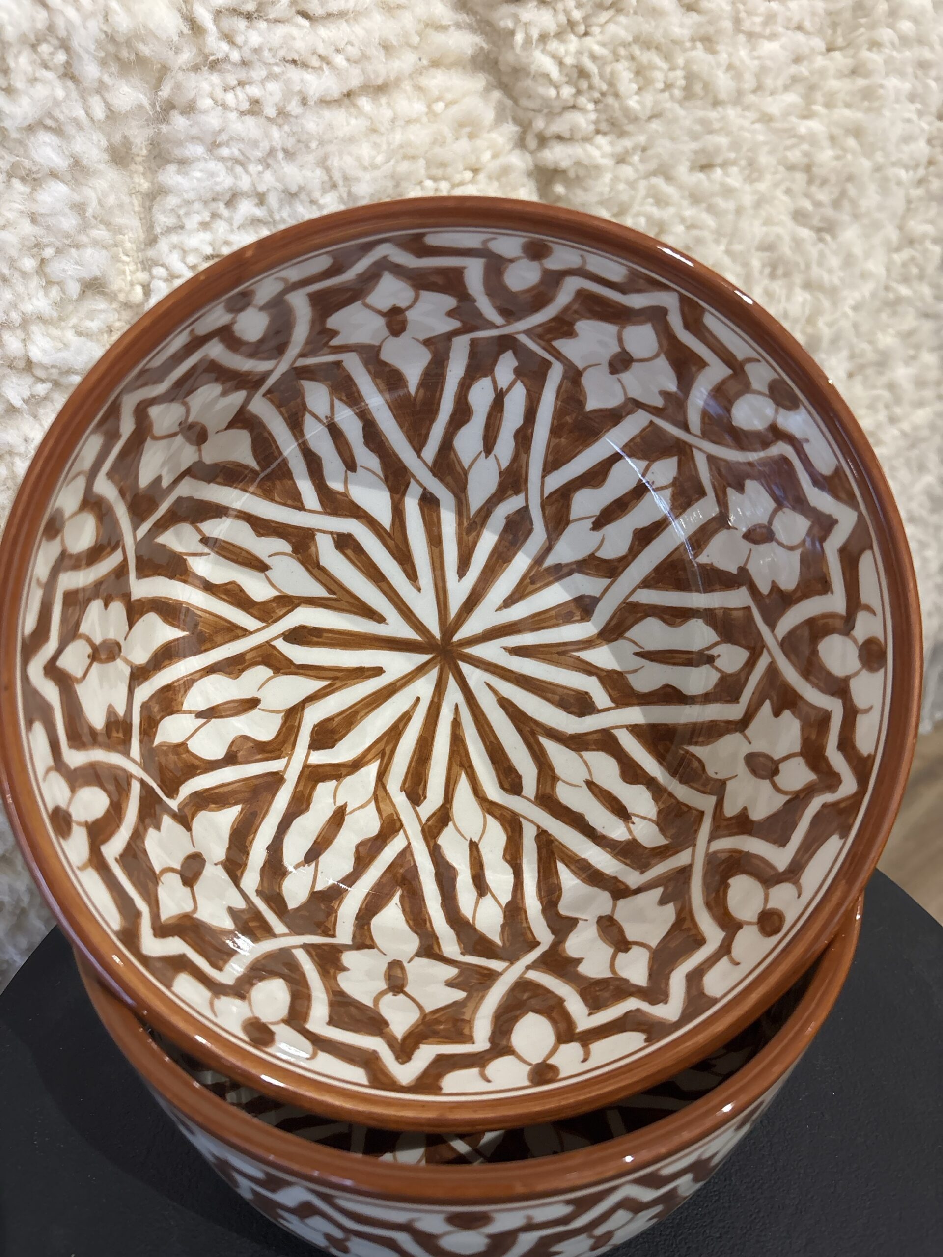 Deze diepe salade kommen zijn gemaakt in fes. Ze zijn vaatwasser bestendig en je kan ze ook als decoratie ophangen aan de muur. Ze hebben een diameter van 22 cm en zijn 13 cm hoog.
