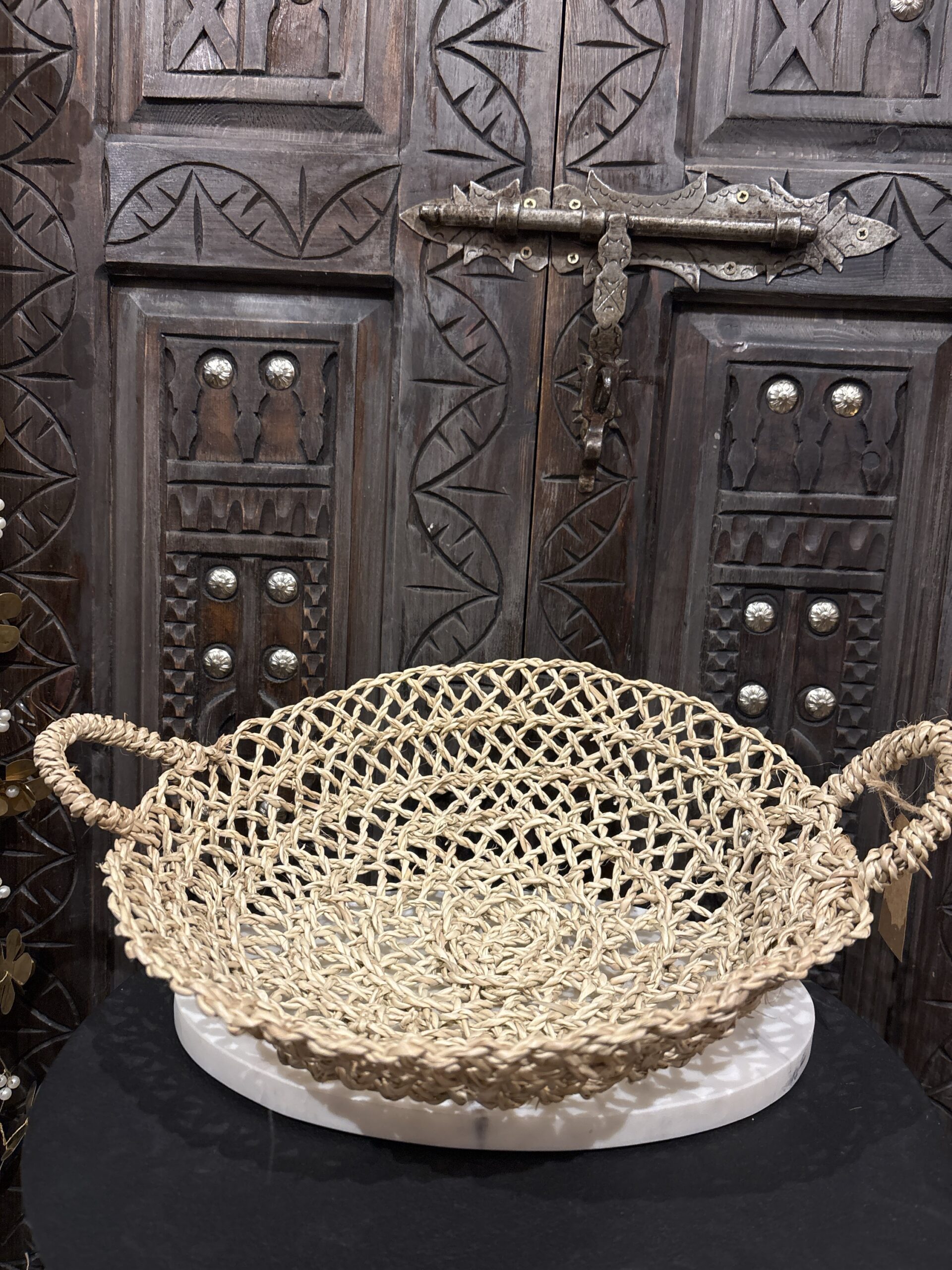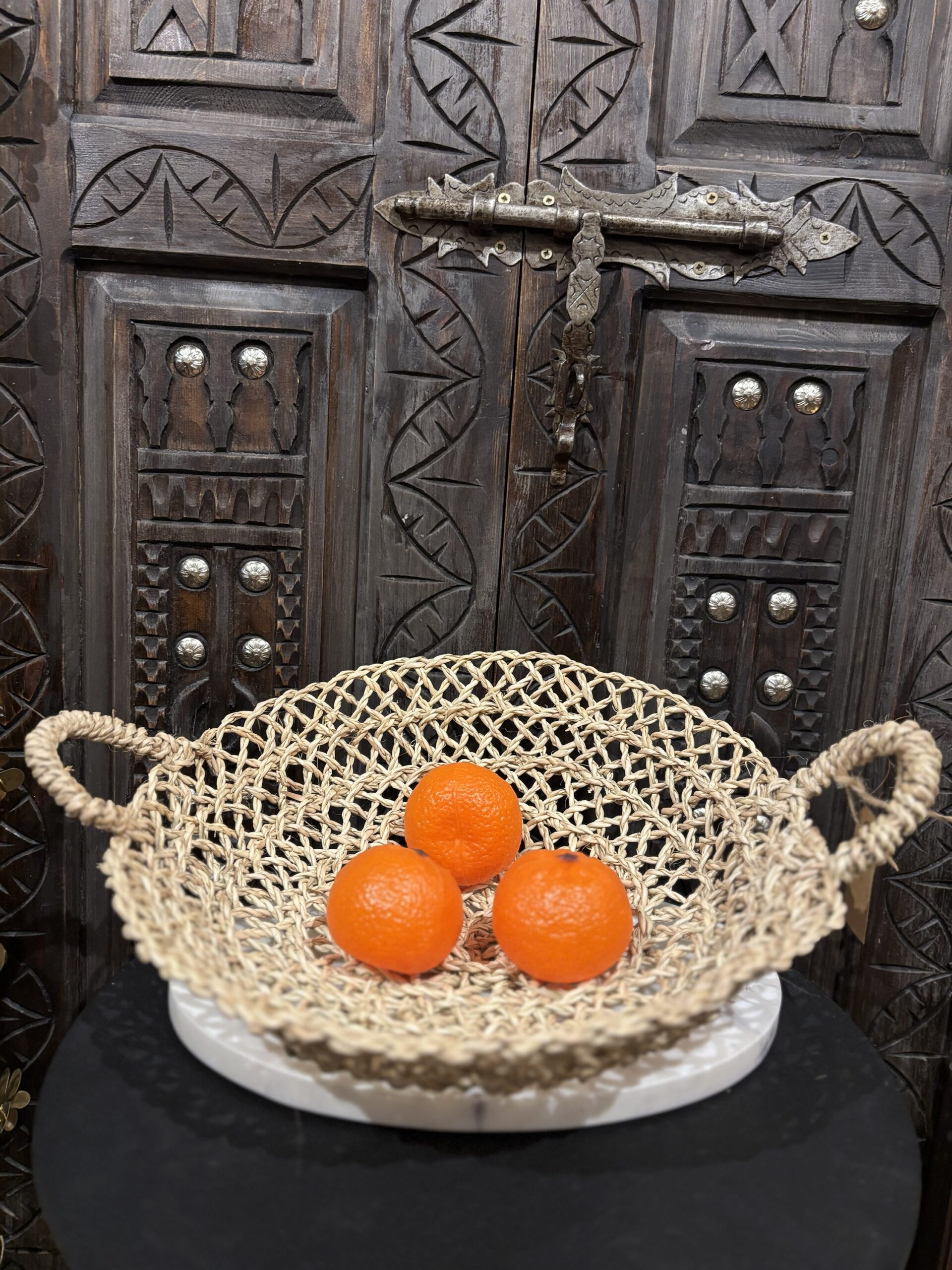 Deze mand is gemaakt in Marokko. Zeegras is gevlochten met elkaar tot een uniek stuk. De mand heeft een diameter van 35 cm. Je kan er fruit is zetten of decoratief ophangen.