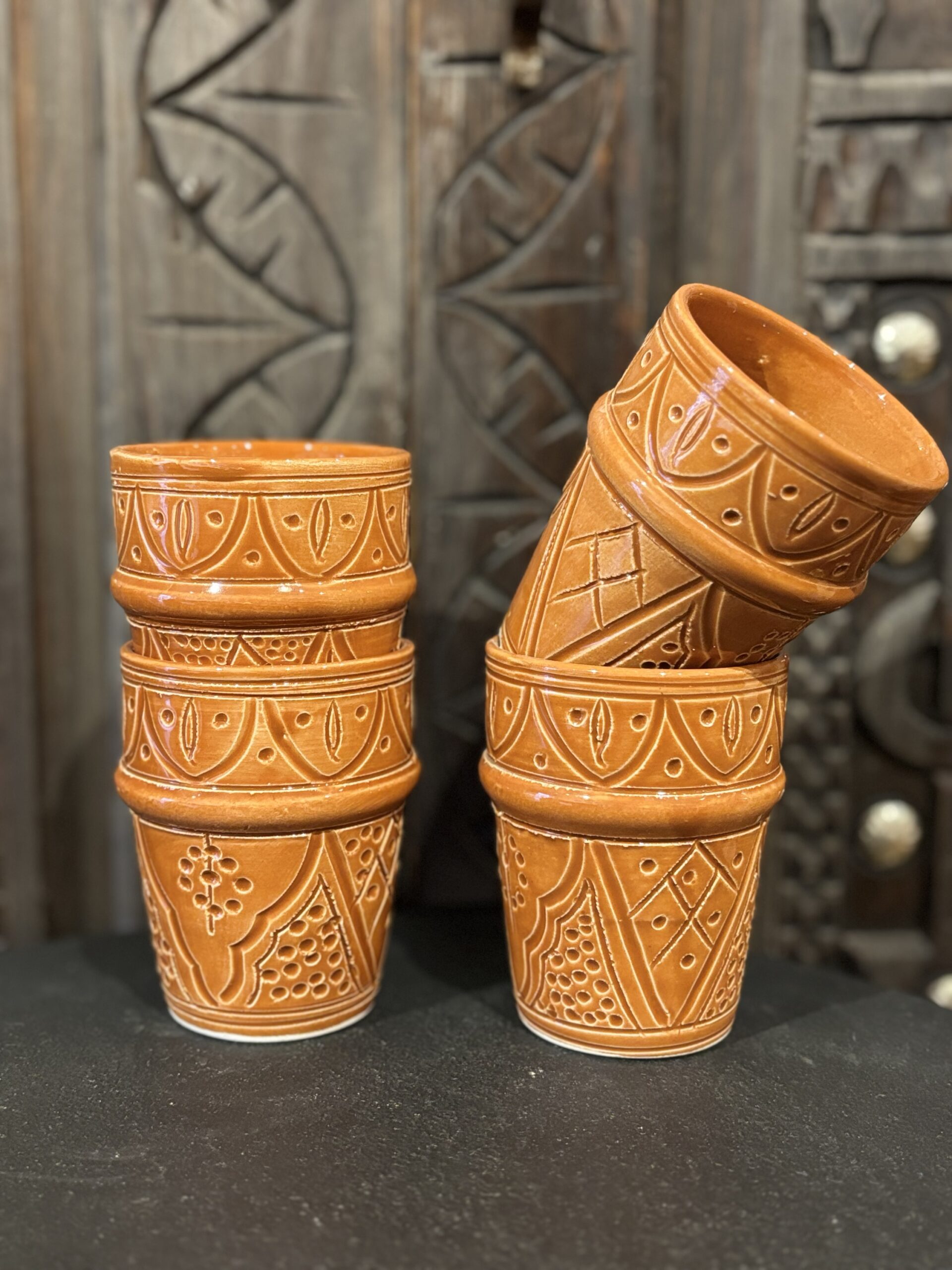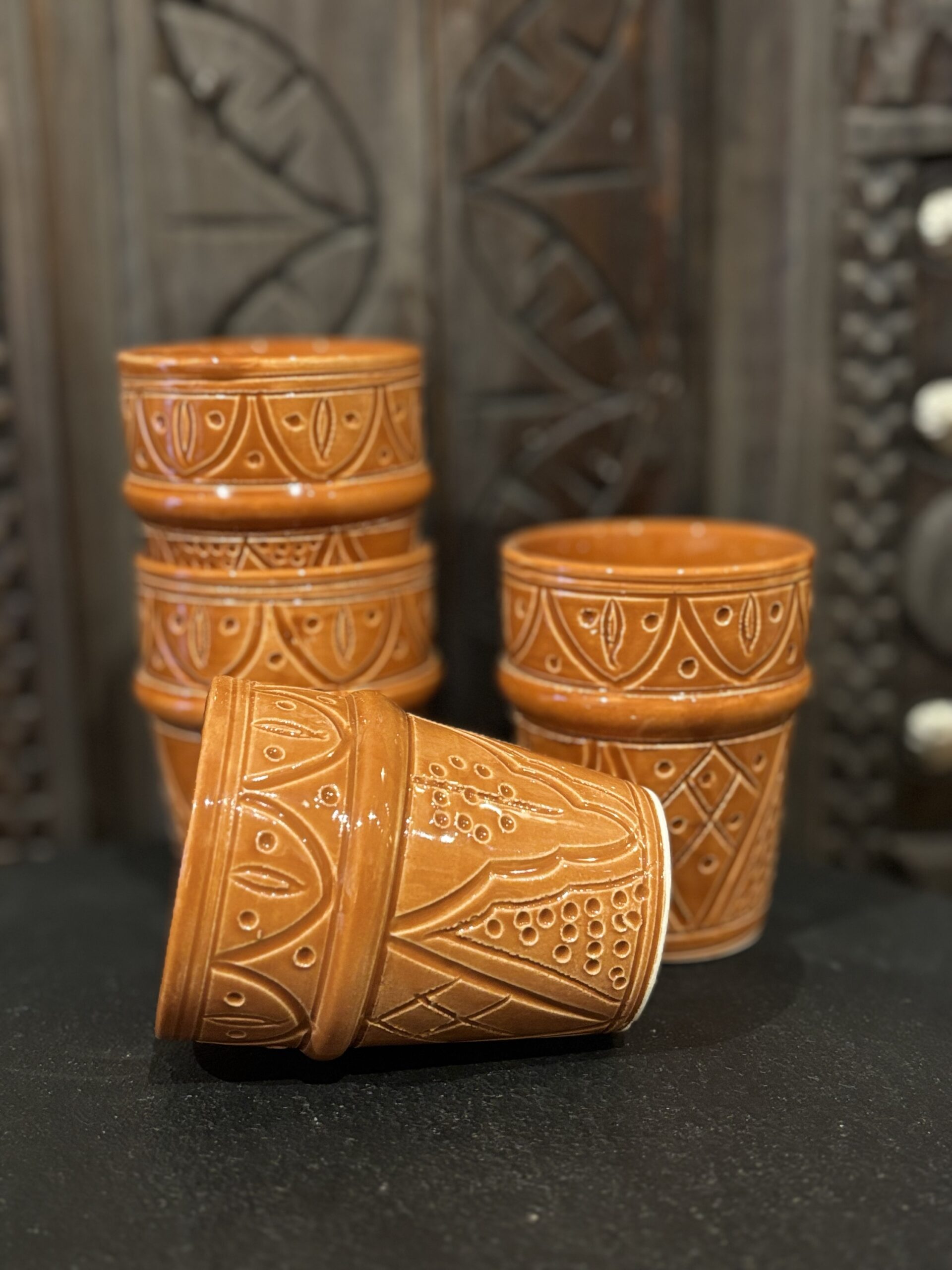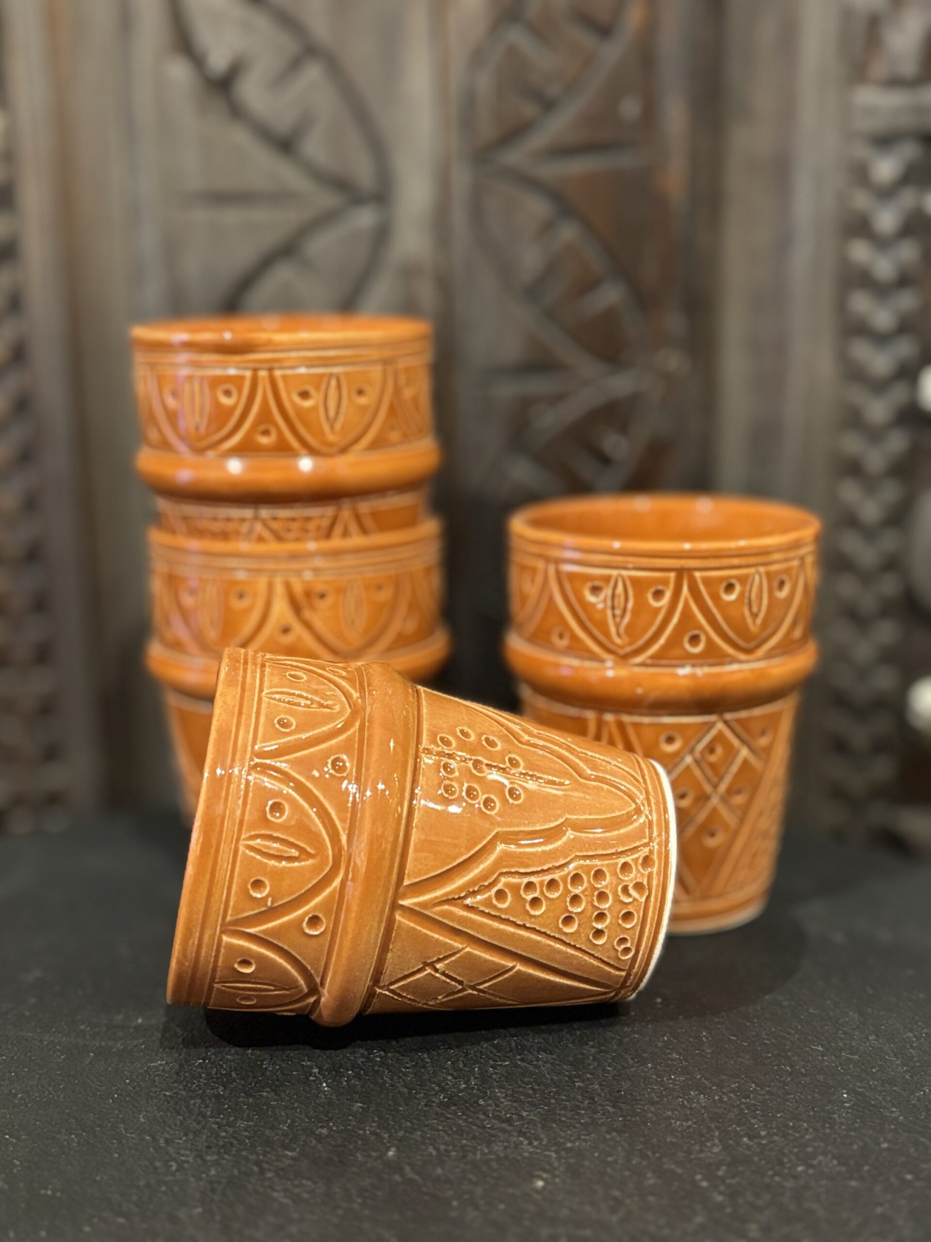 Deze beker is in Marokko gemaakt. De traditionele patronen en de mooie bruine kleur geven het een tijdloze effect. Perfect voor een cappuccino. 10 cm hoog 7 cm breed