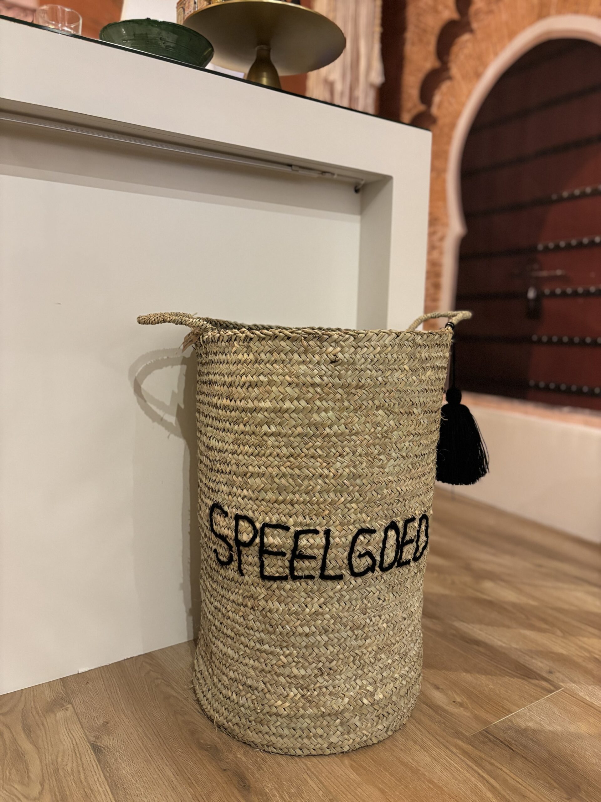Handige en decoratieve rieten speelgoedmand. Ideaal voor het opbergen van speelgoed in de kinderkamer of woonkamer.