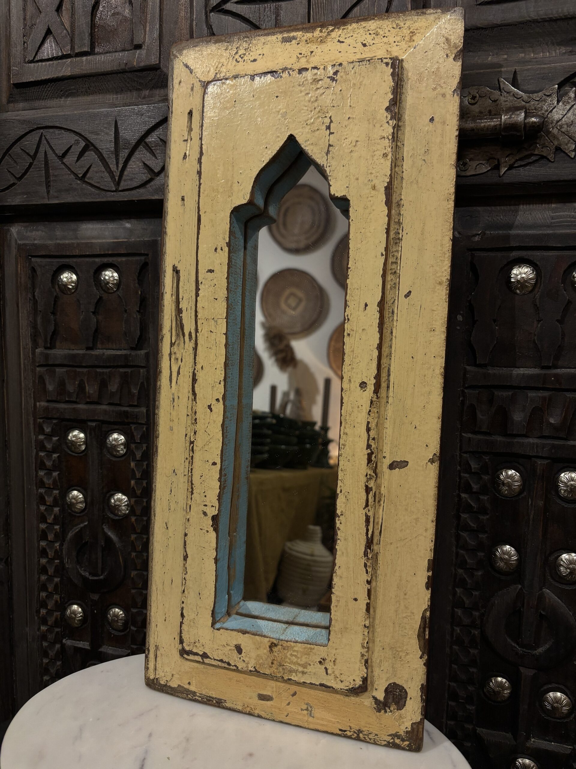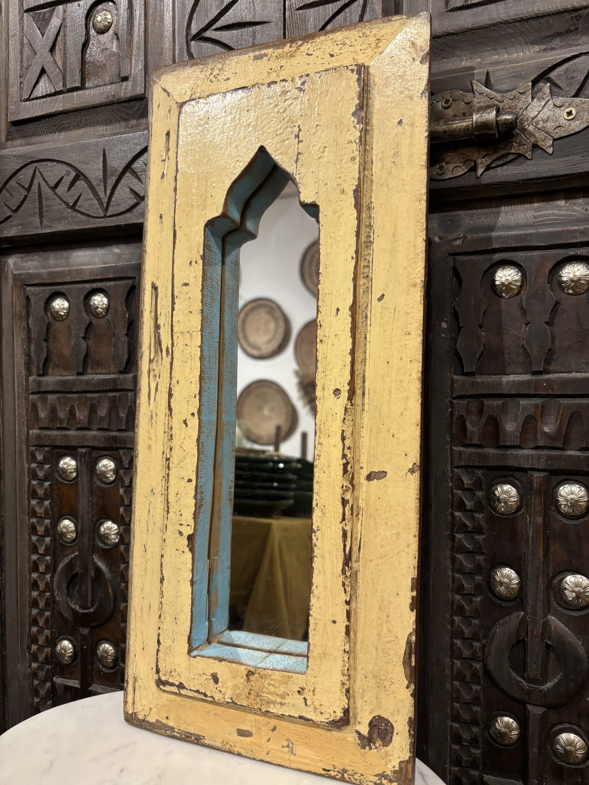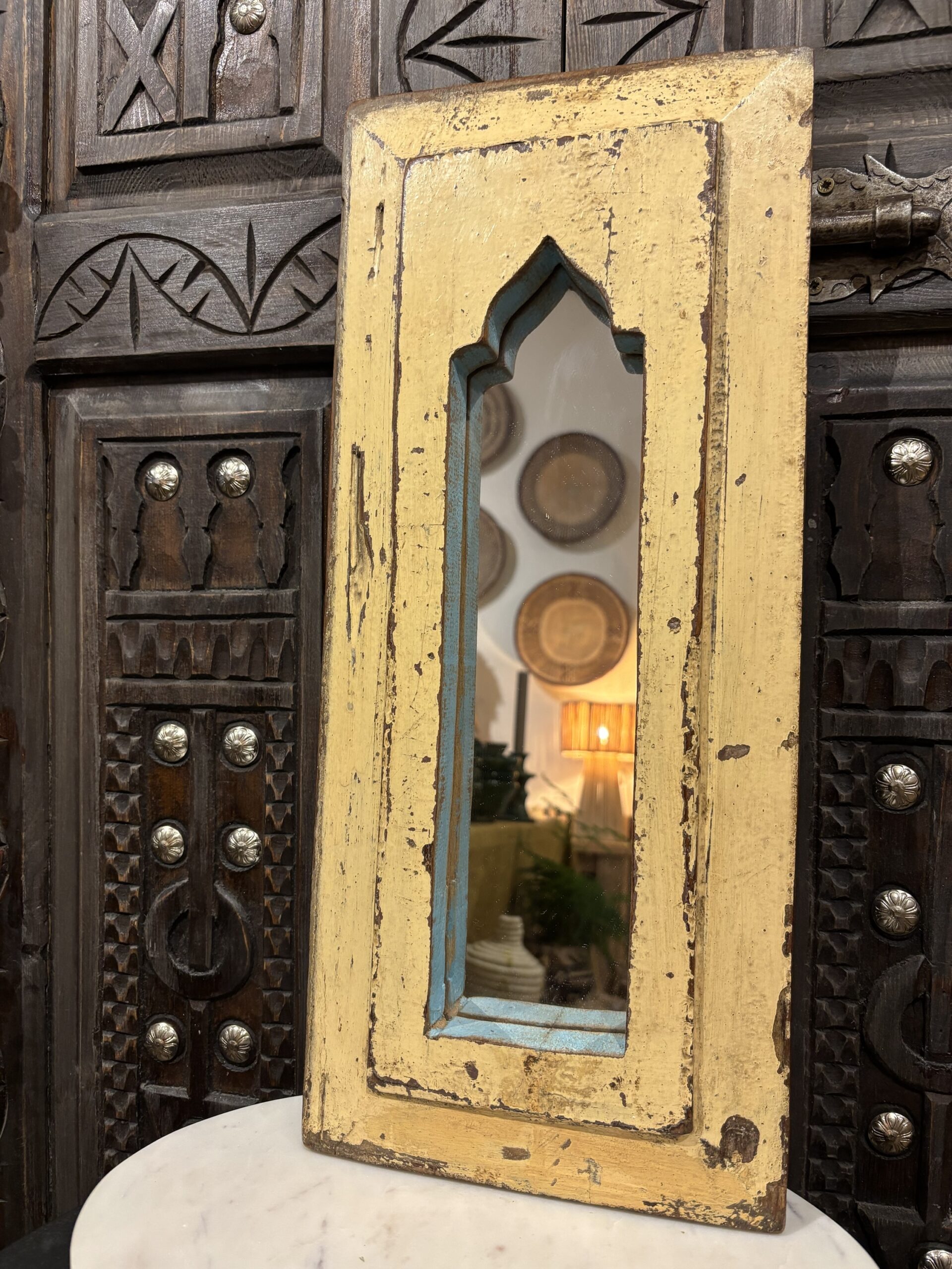 Een spiegel die niet alleen je reflectie vangt, maar ook een verhaal vertelt. Handgemaakt, doorleefd en vol oosterse charme. Deze spiegel is gemaakt in India. Hoogte: 45cm Breedte: 20cm