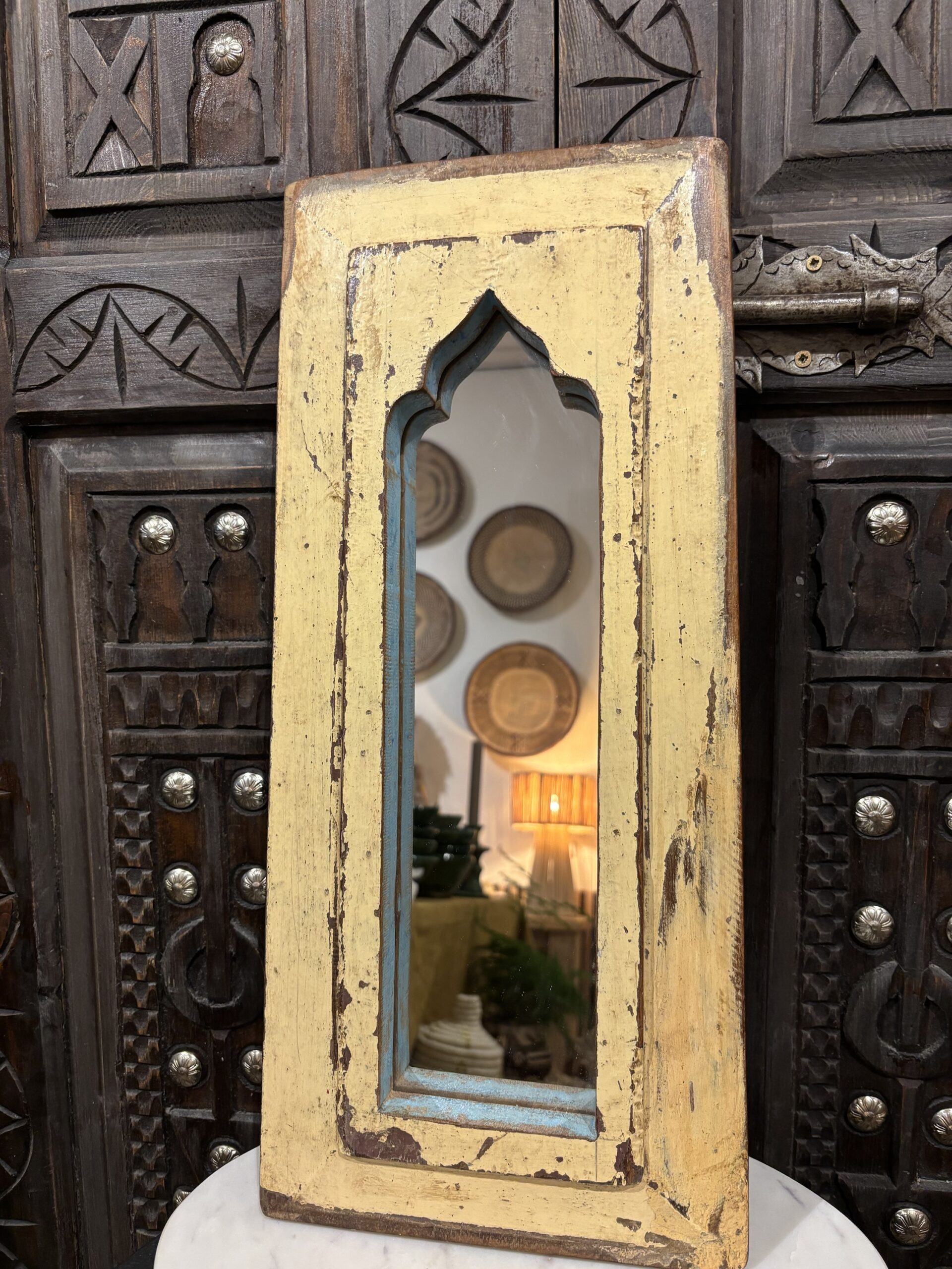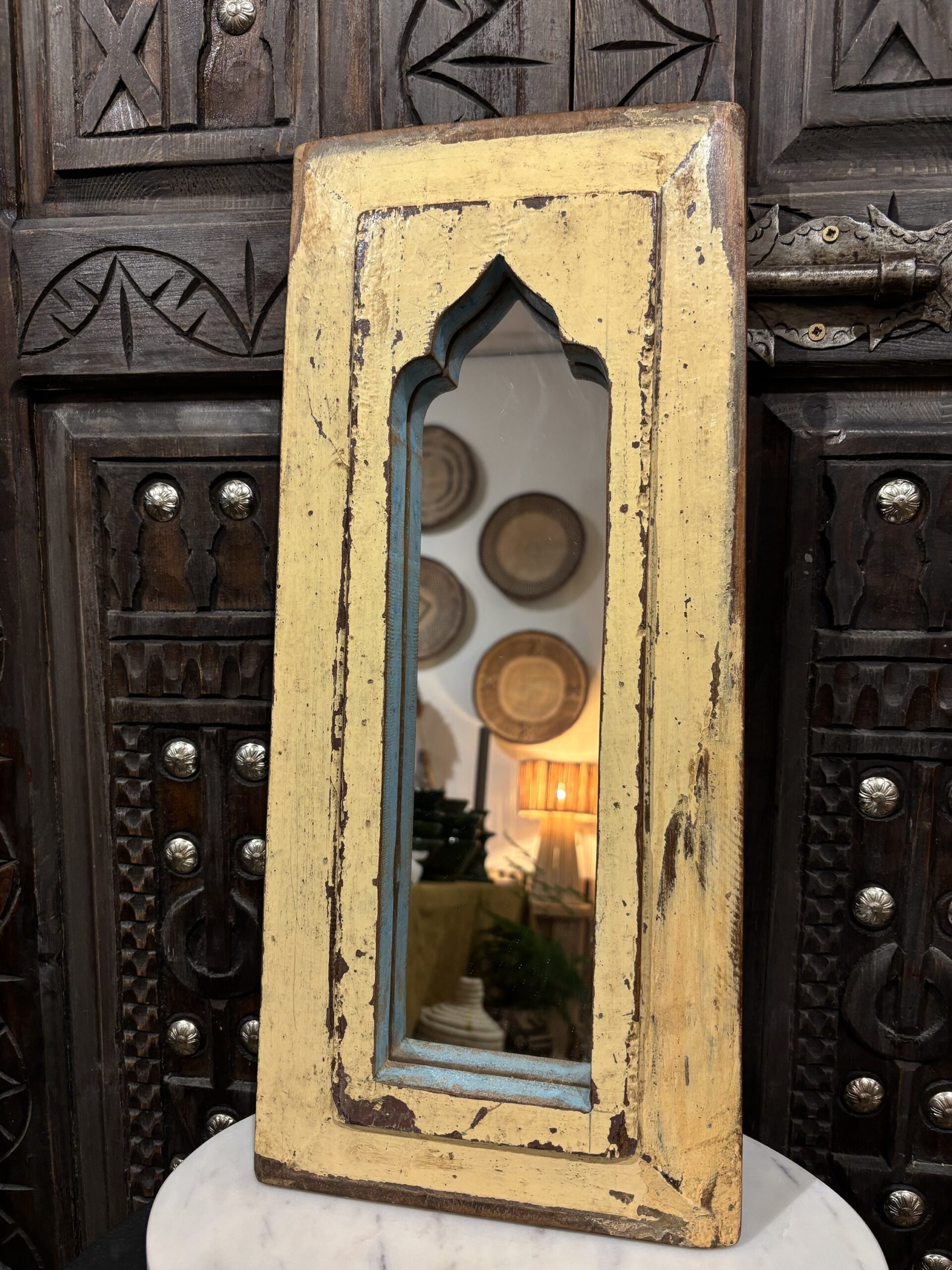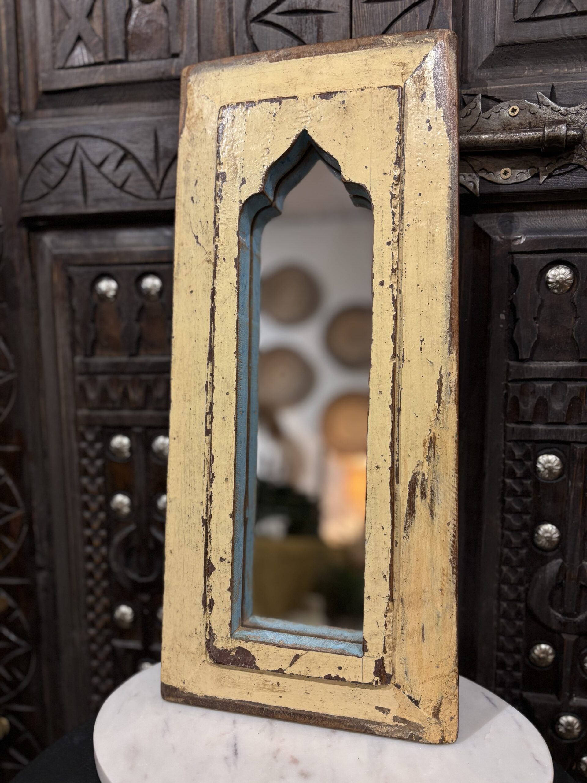 Een spiegel die niet alleen je reflectie vangt, maar ook een verhaal vertelt. Handgemaakt, doorleefd en vol oosterse charme. Deze spiegel is gemaakt in India. Hoogte: 46cm Breedte: 20cm