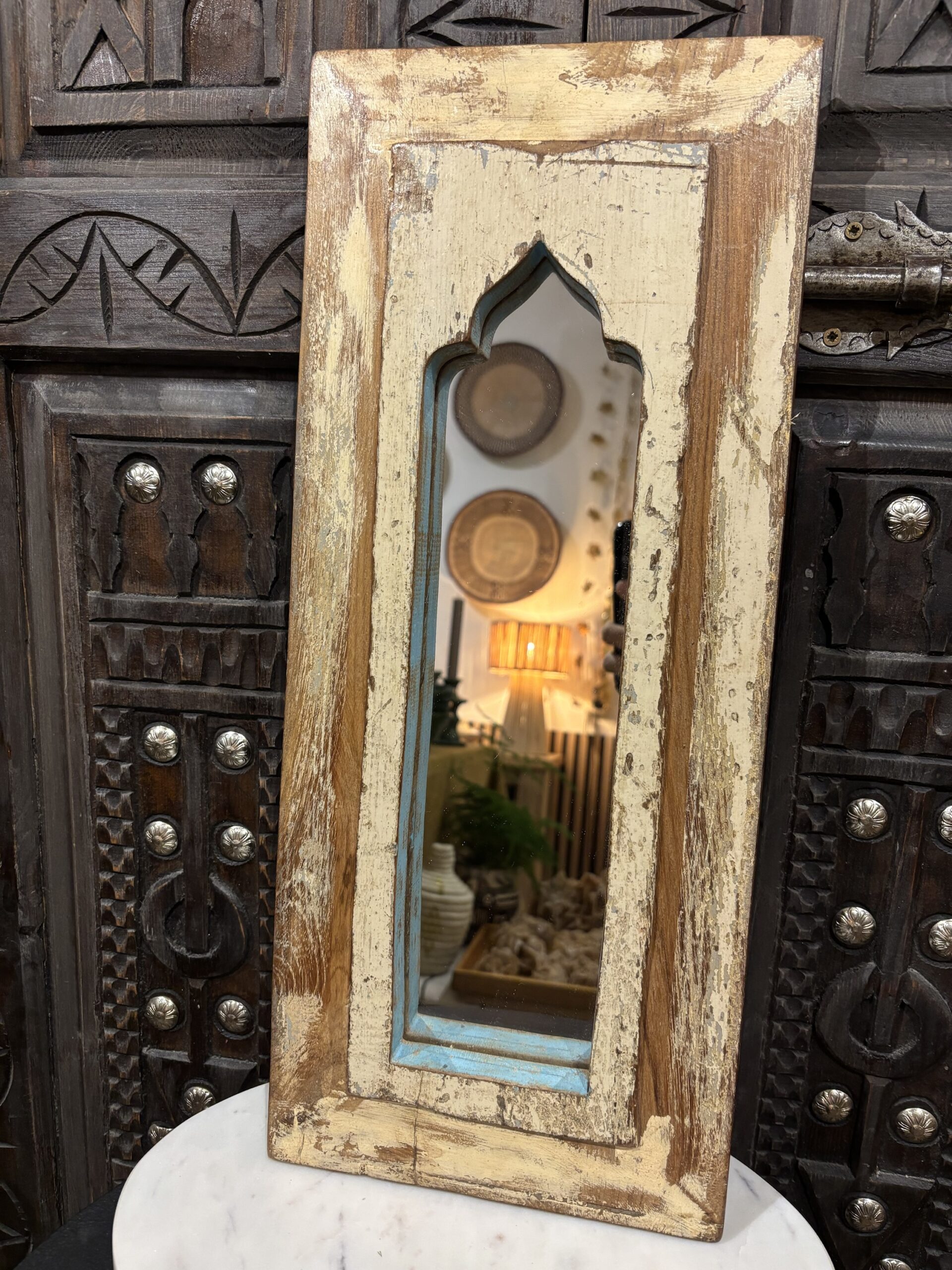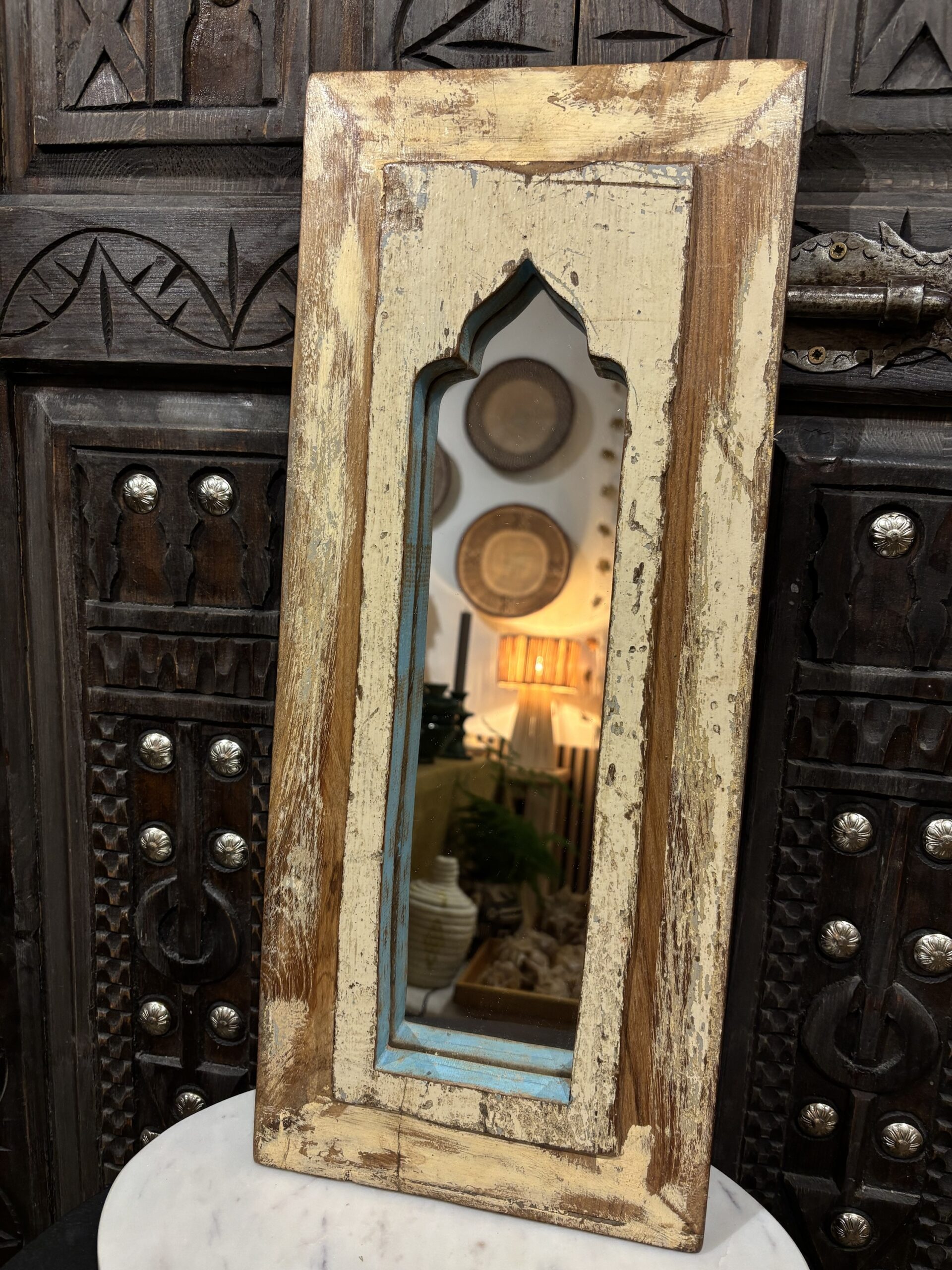 Een spiegel die niet alleen je reflectie vangt, maar ook een verhaal vertelt. Handgemaakt, doorleefd en vol oosterse charme. Deze spiegel is gemaakt in India. Hoogte: 48 cm Breedte: 20 cm