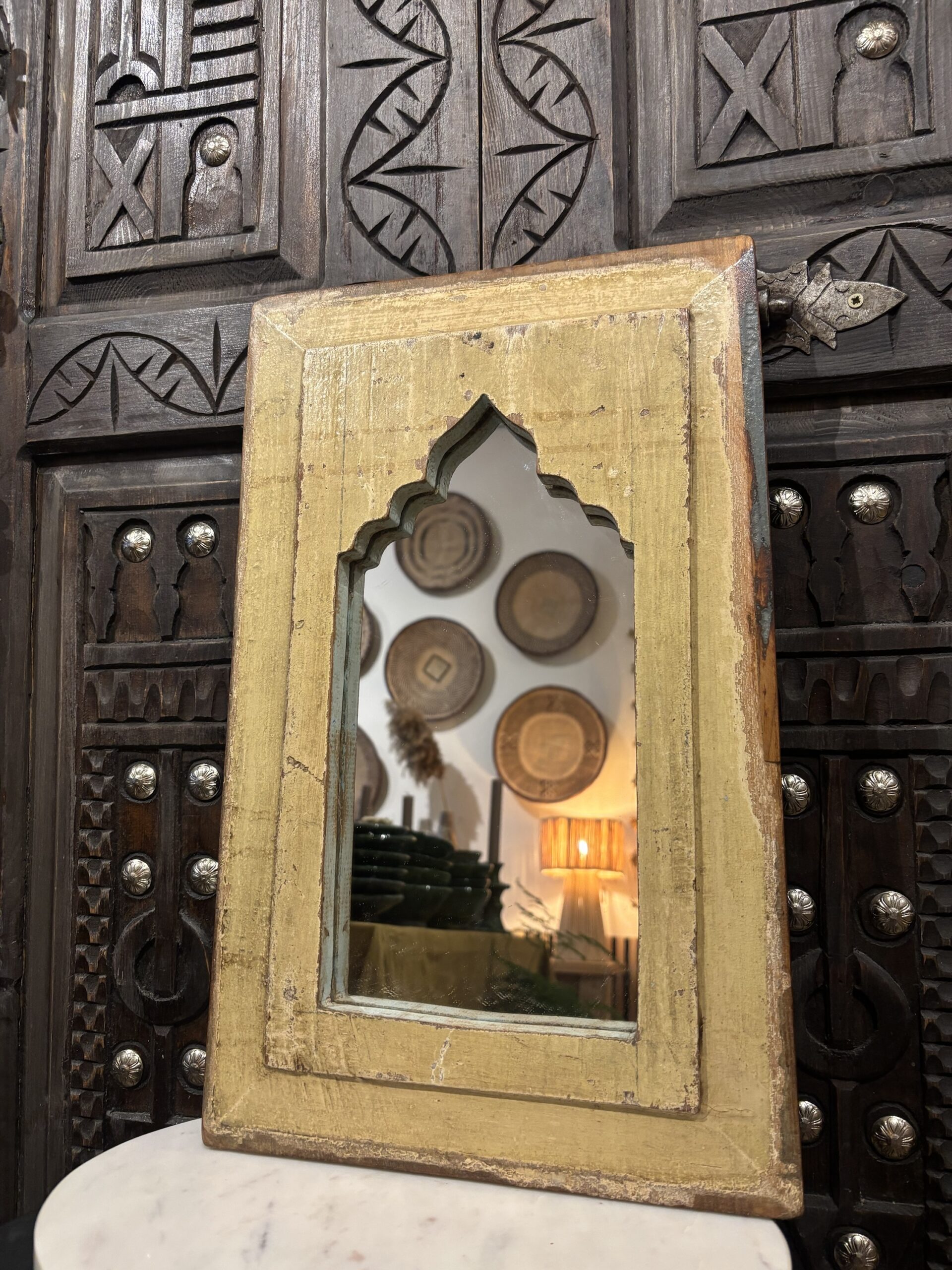 Een spiegel die niet alleen je reflectie vangt, maar ook een verhaal vertelt. Handgemaakt, doorleefd en vol oosterse charme. Deze spiegel is gemaakt in India.