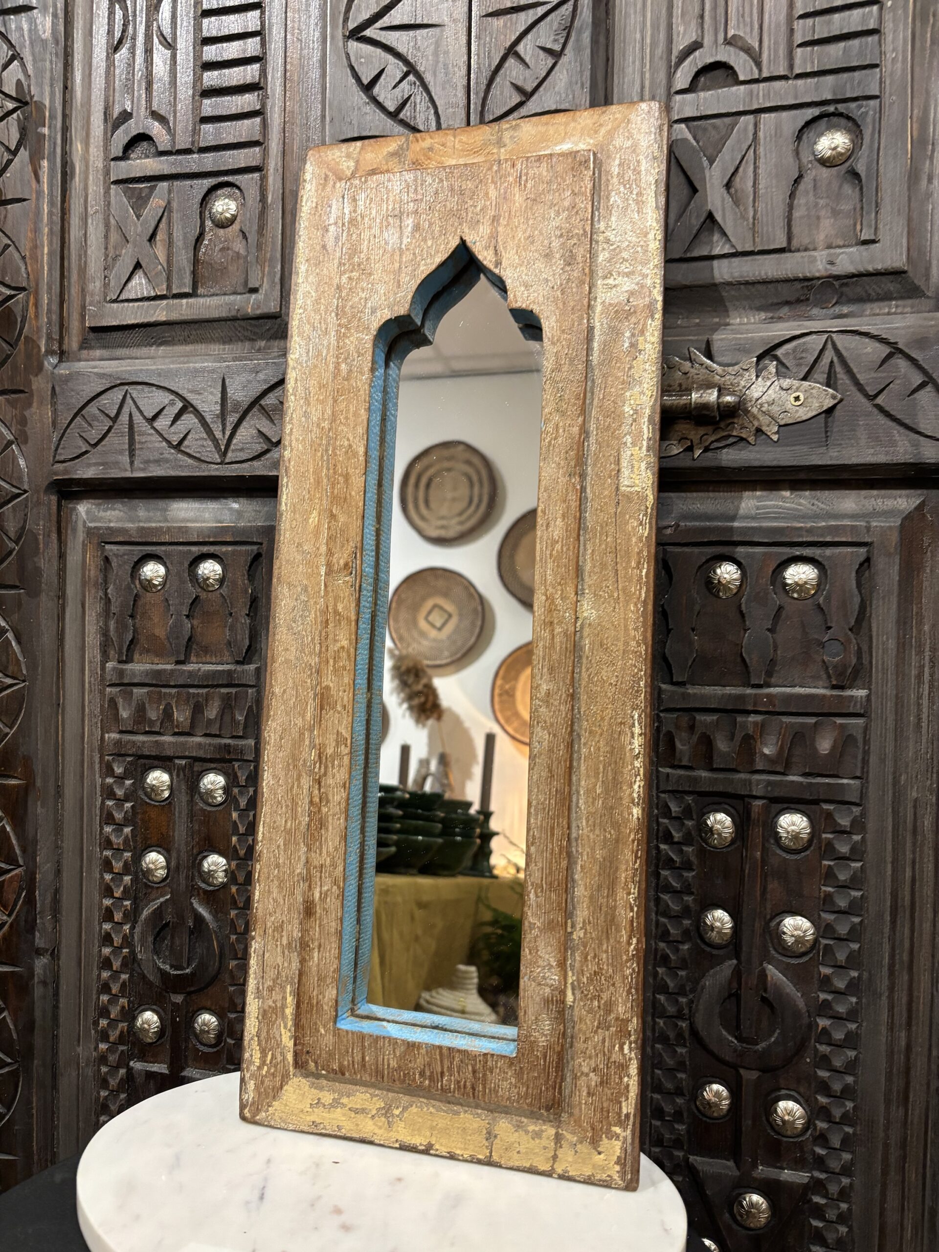 Een spiegel die niet alleen je reflectie vangt, maar ook een verhaal vertelt. Handgemaakt, doorleefd en vol oosterse charme. Deze spiegel is gemaakt in India. Hoogte: 55 cm Breedte: 21 cm