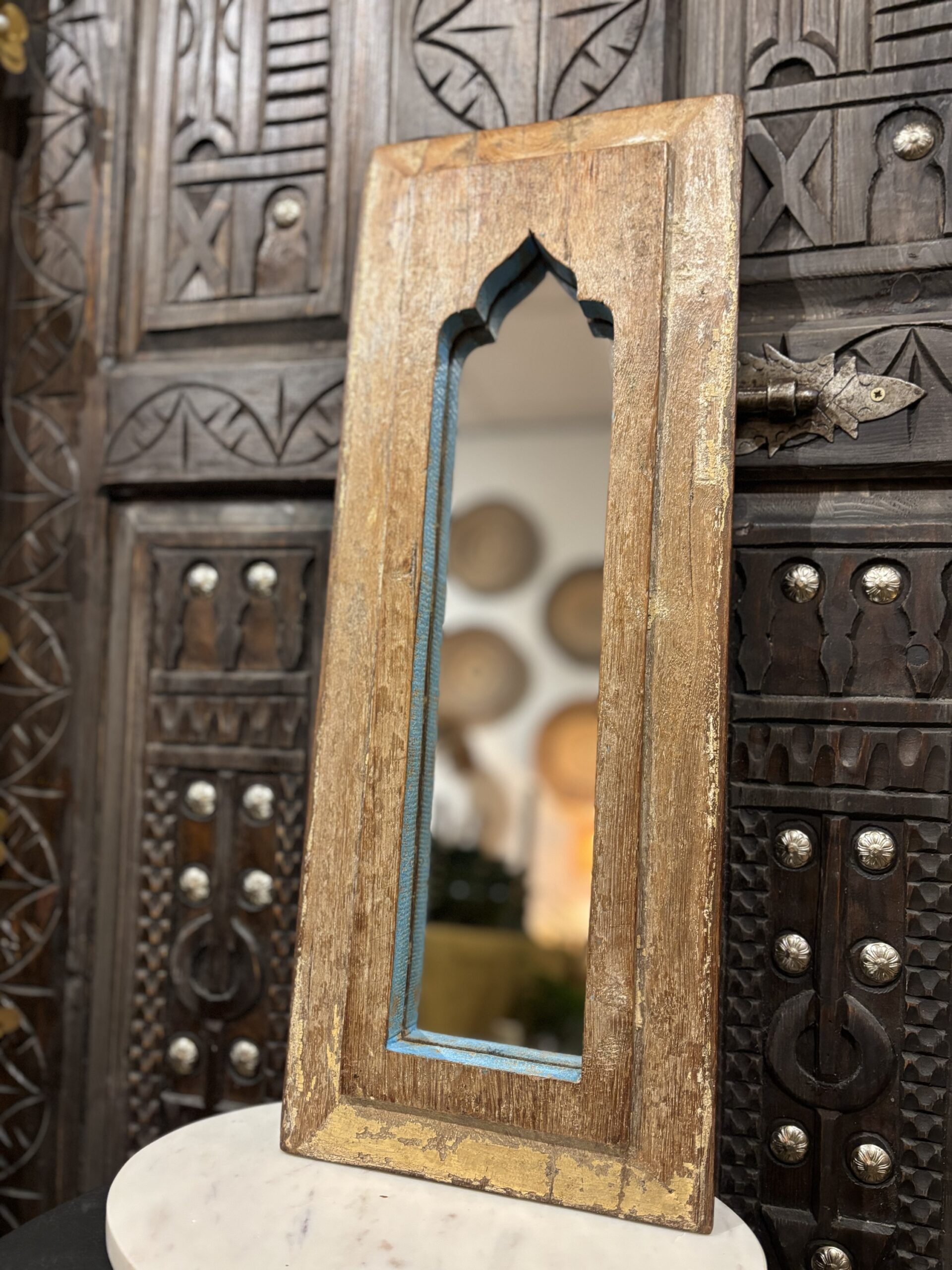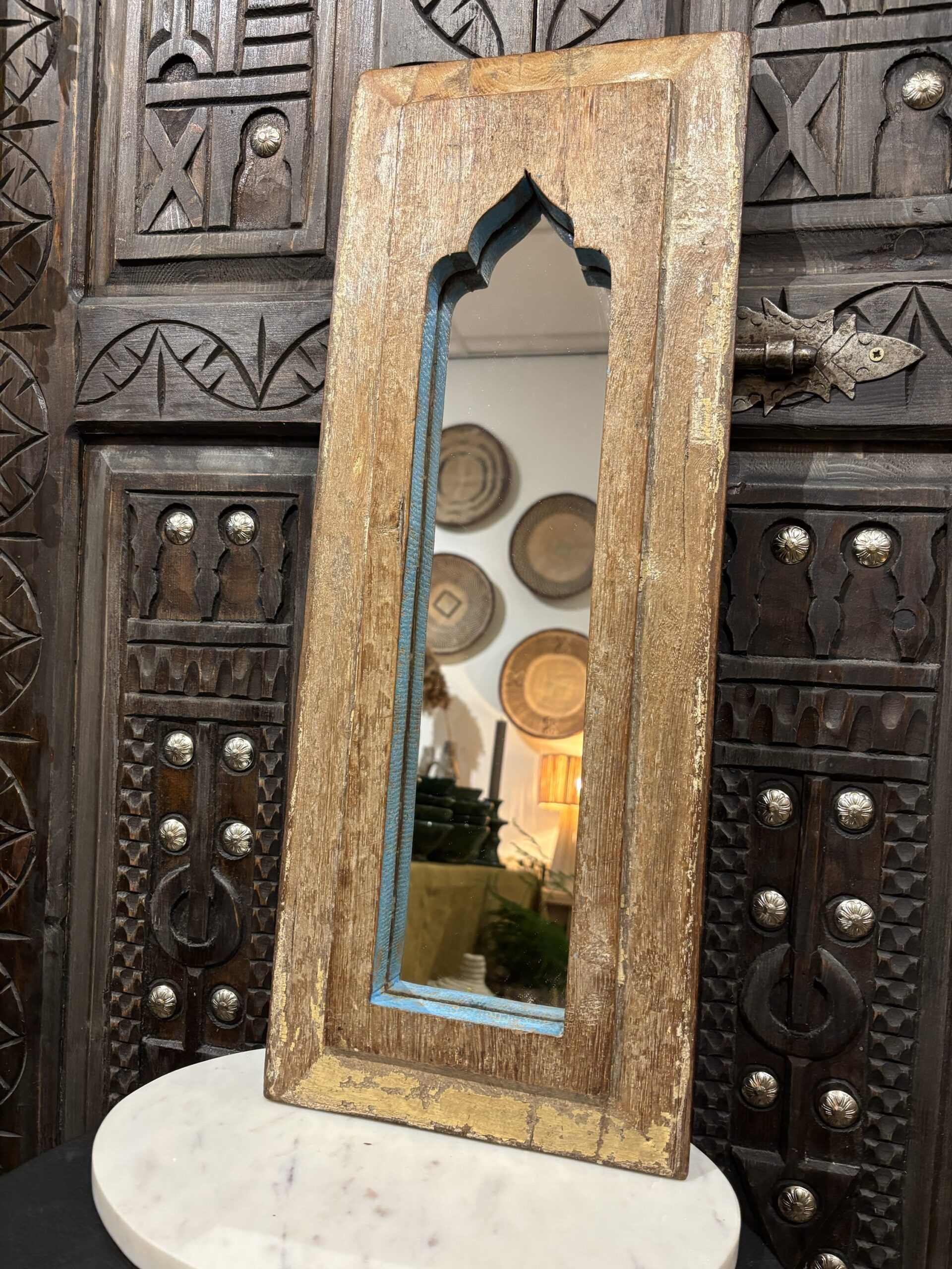 Een spiegel die niet alleen je reflectie vangt, maar ook een verhaal vertelt. Handgemaakt, doorleefd en vol oosterse charme. Deze spiegel is gemaakt in India.