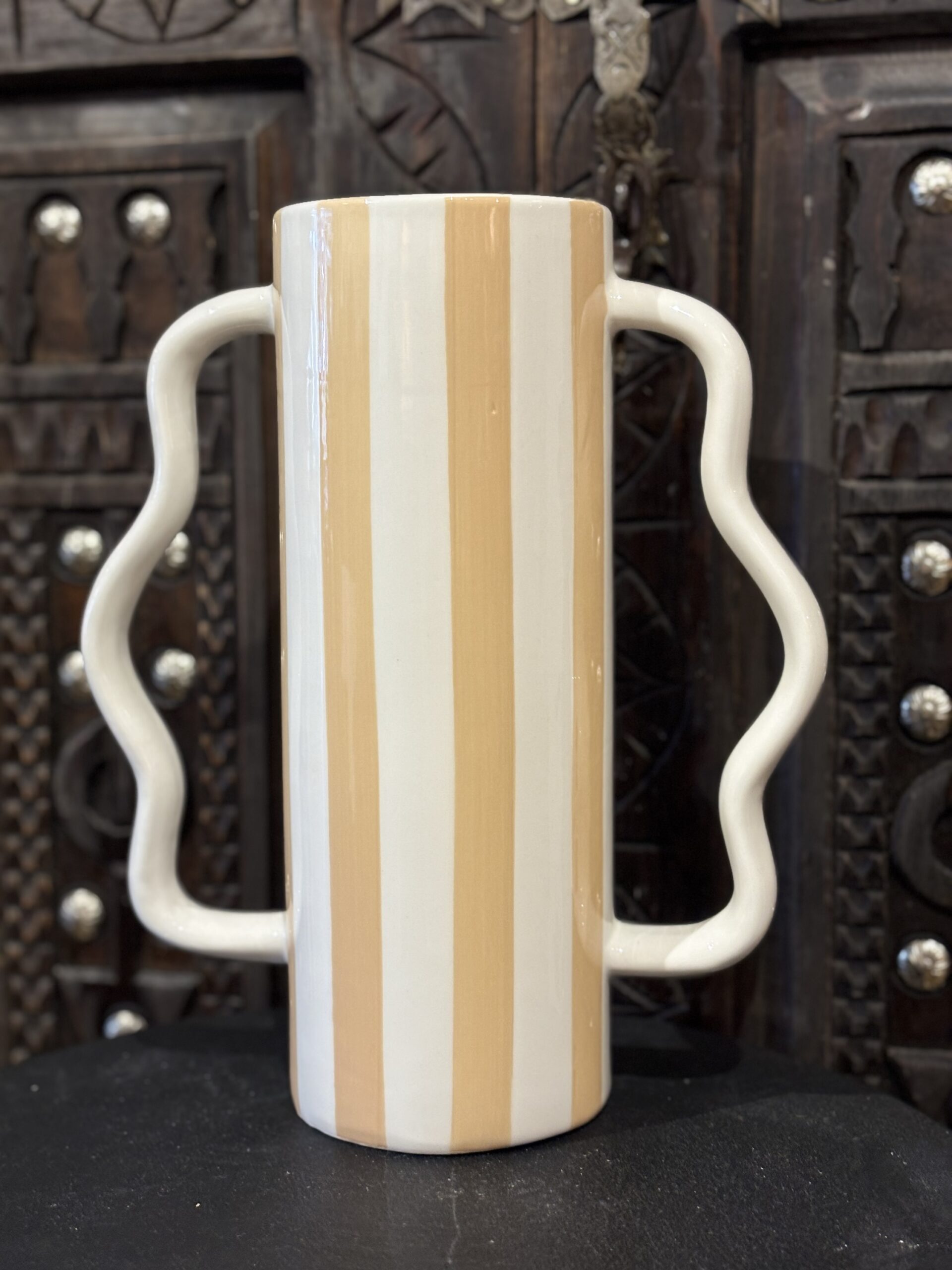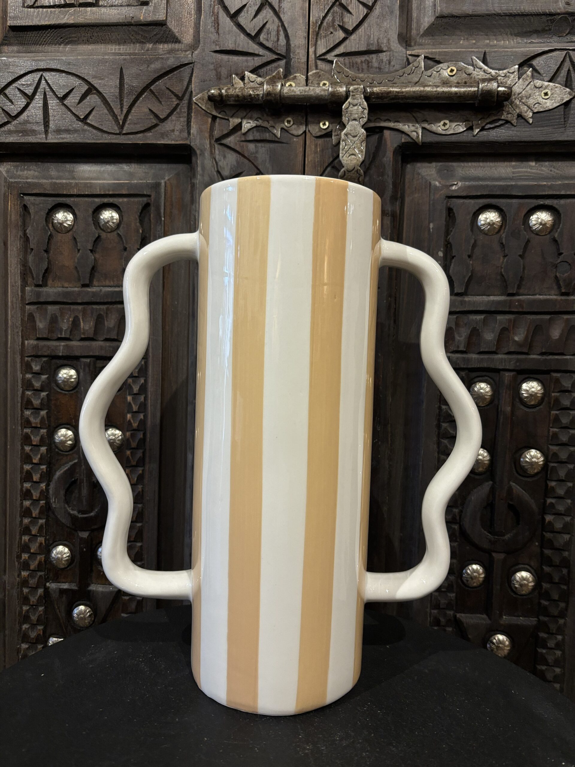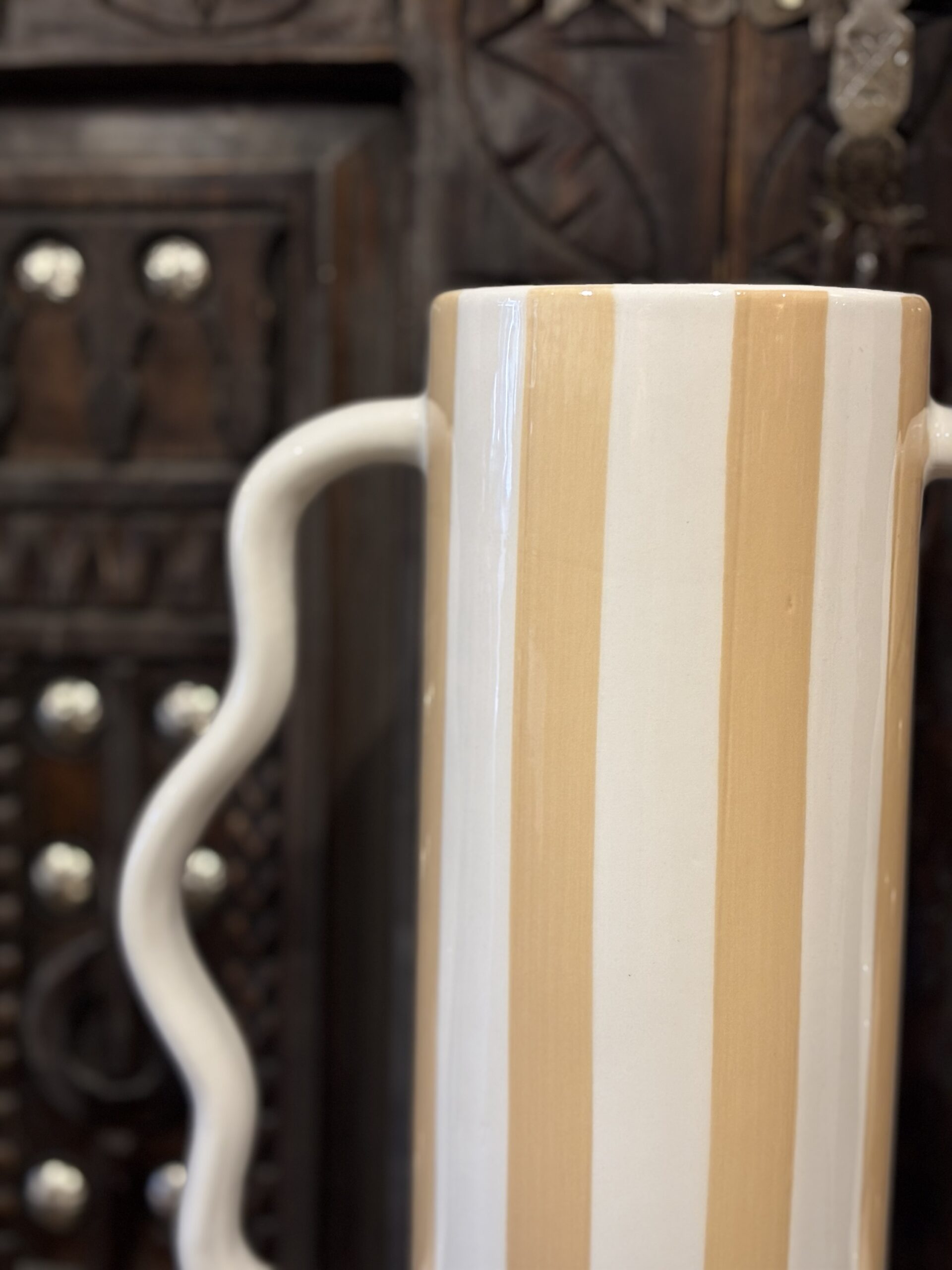 Vaas met beige-witte strepen en speelse handgrepen. Een vrolijke eyecatcher met echte summer vibes! Perfect voor droogbloemen of gewoon puur decoratief. ☀️✨ Hoogte 30 cm Diameter 11cm Breedte met oortjes 25 cm