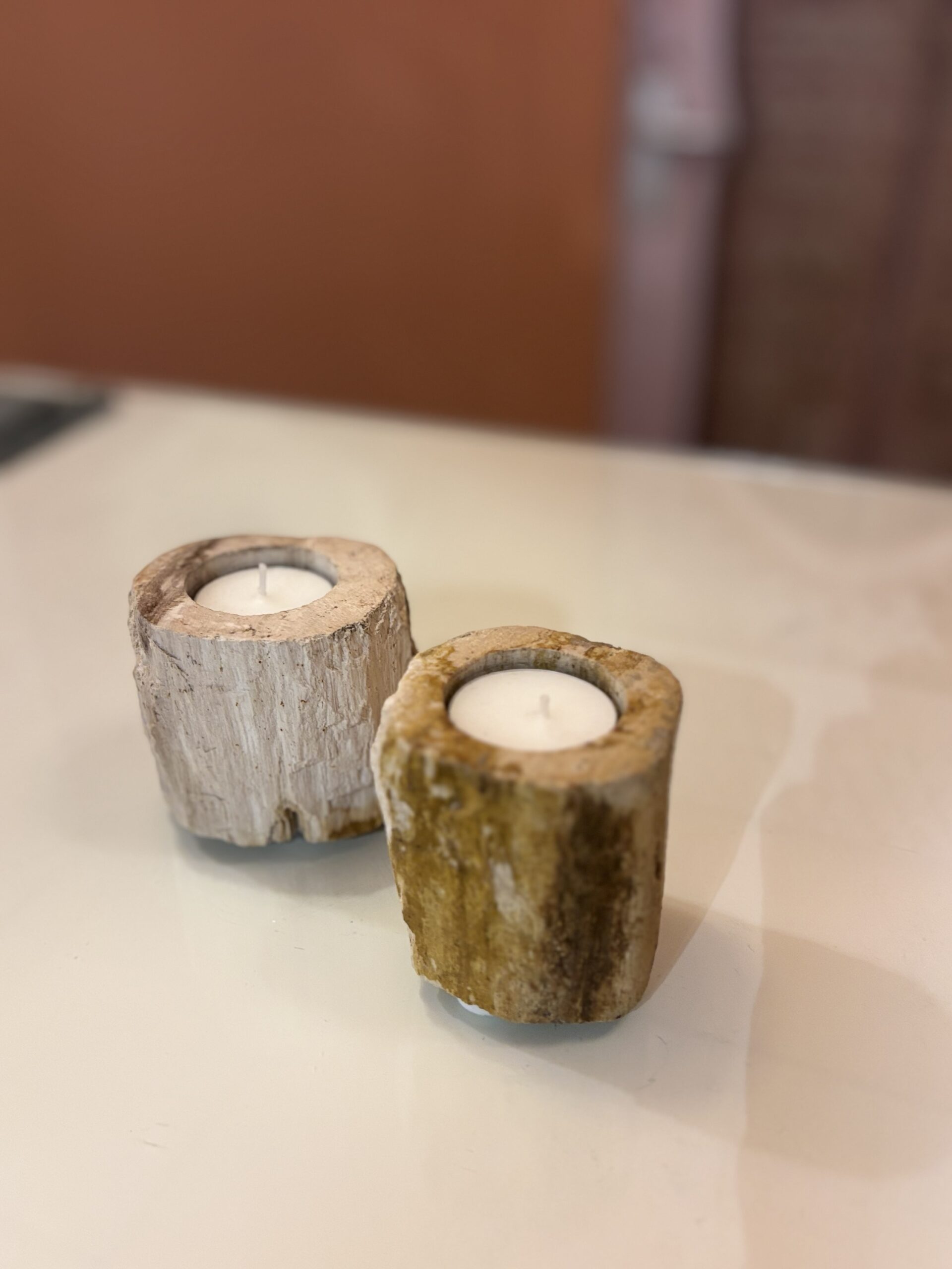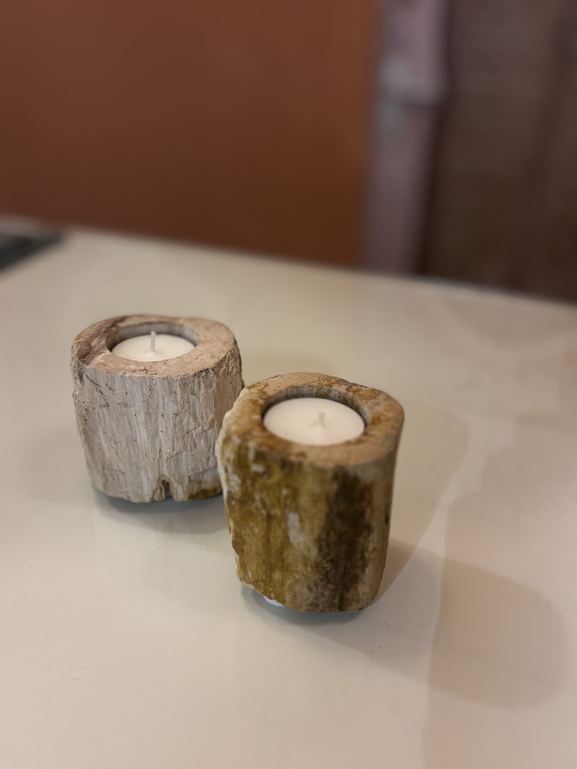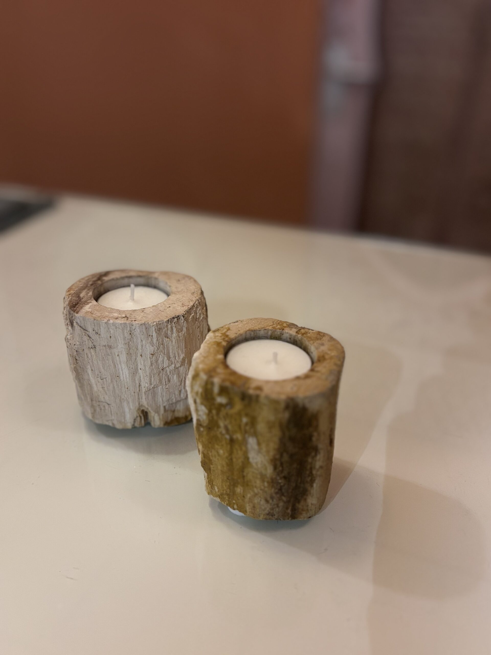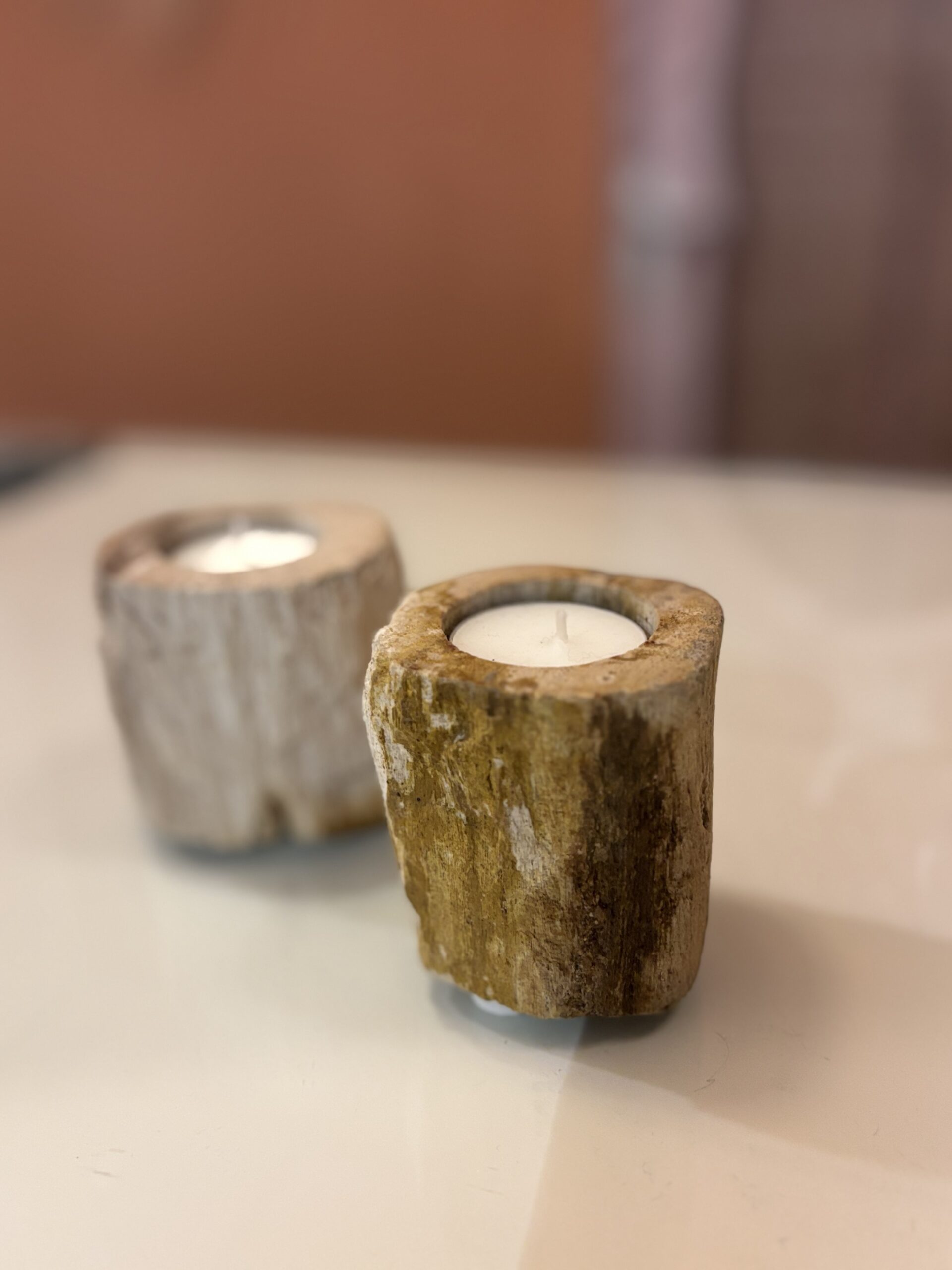Waxinelichthouder uit Indonesië van versteend hout dat is ontstaan en gevormd door vulkaanuitbarstingen.