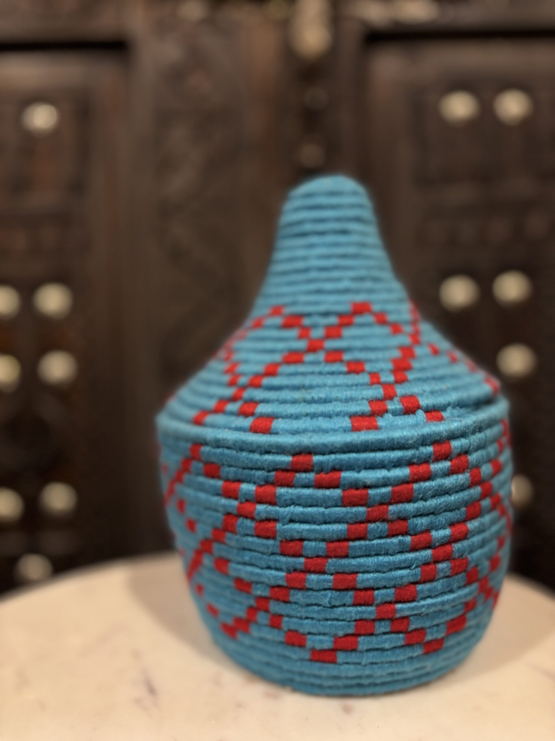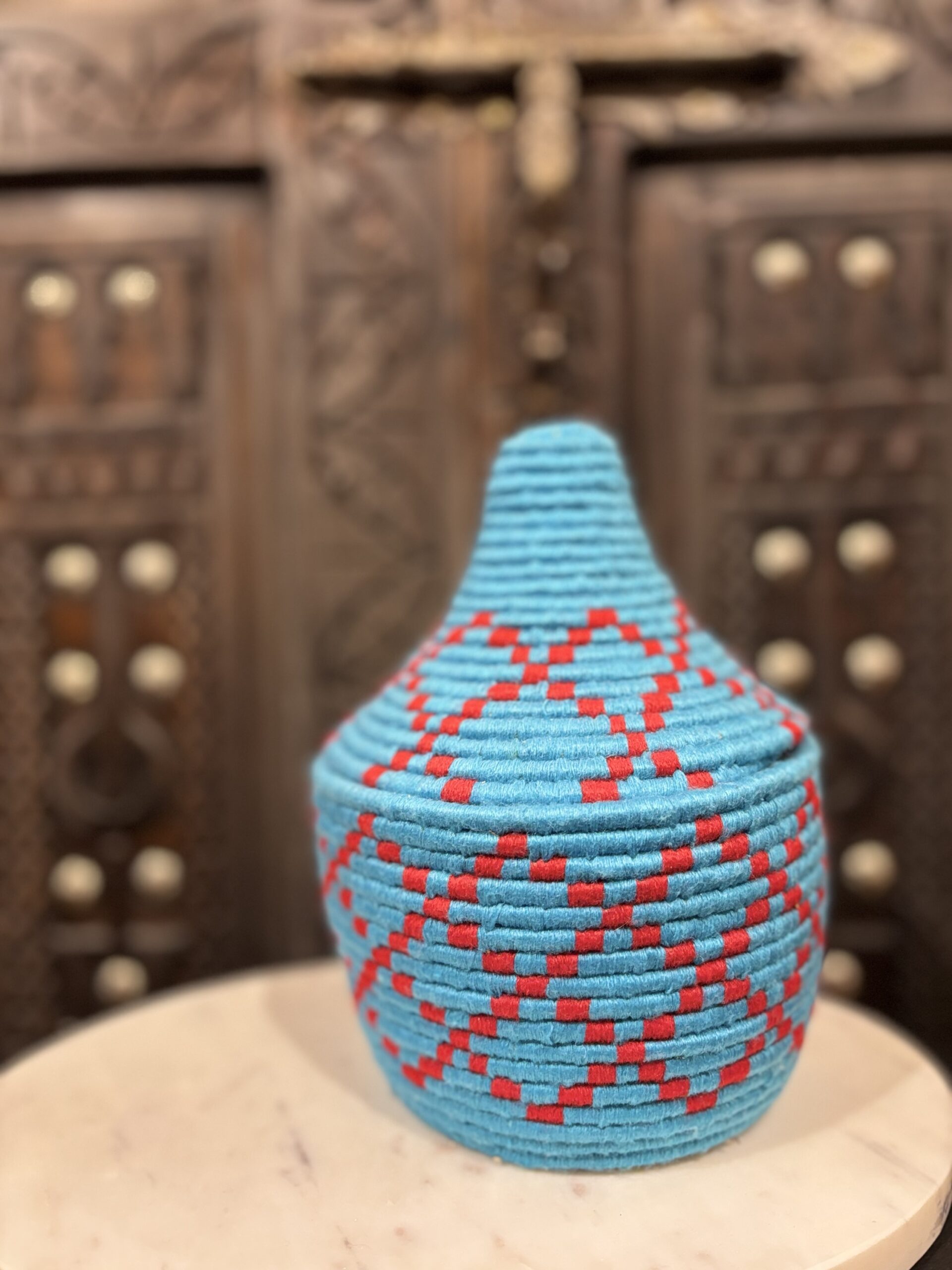 De manden zijn volledig met de hand gemaakt in het noorden van Marokko. De manden krijgen hun eigen patroon en kleur welke handmatig met wol op de mand wordt geweven. Van elke mand is er slechts één stuk verkrijgbaar en is daardoor uniek in zijn soort!