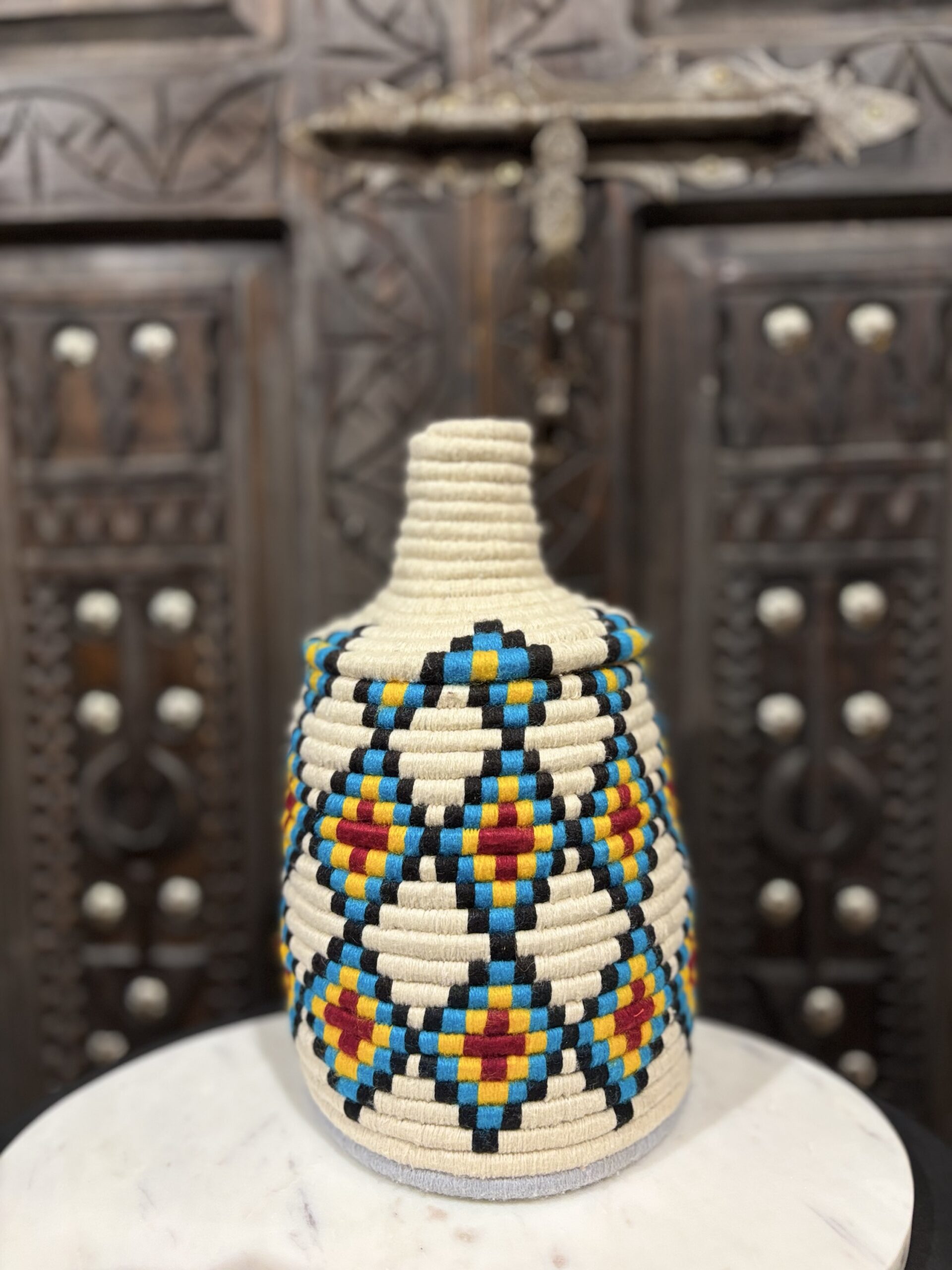 De manden zijn volledig met de hand gemaakt in het noorden van Marokko. De manden krijgen hun eigen patroon en kleur welke handmatig met wol op de mand wordt geweven. Van elke mand is er slechts één stuk verkrijgbaar en is daardoor uniek in zijn soort!