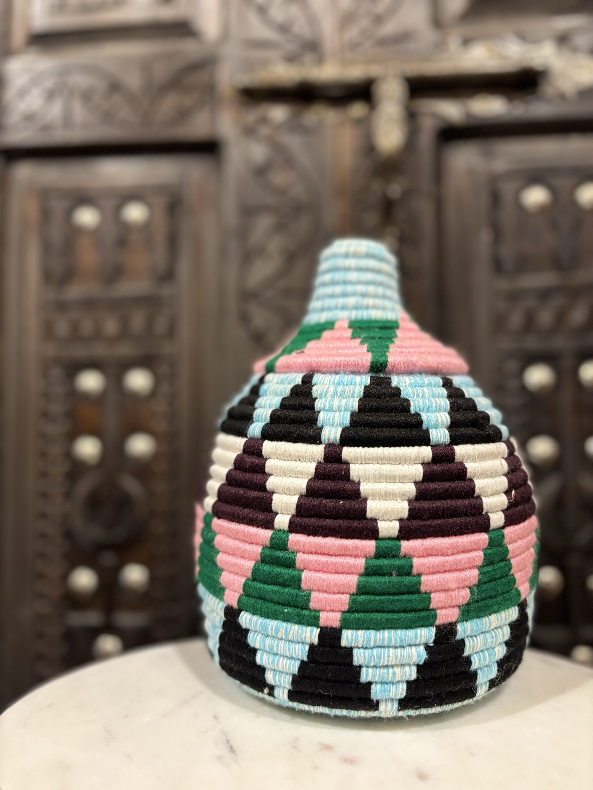 De manden zijn volledig met de hand gemaakt in het noorden van Marokko. De manden krijgen hun eigen patroon en kleur welke handmatig met wol op de mand wordt geweven. Van elke mand is er slechts één stuk verkrijgbaar en is daardoor uniek in zijn soort!